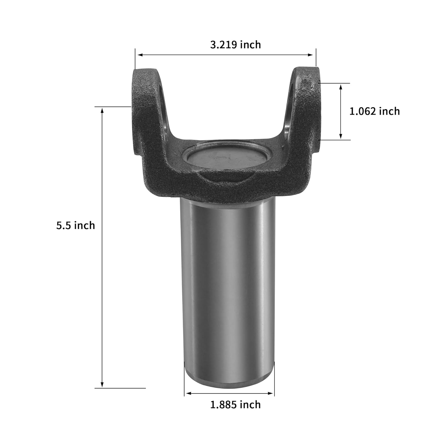 Resposta: As dimensões do yoke incluem um comprimento externo de 3.219”, um diâmetro do cap de rolamento de 1.062” e um diâmetro externo do spline de 1.397”.