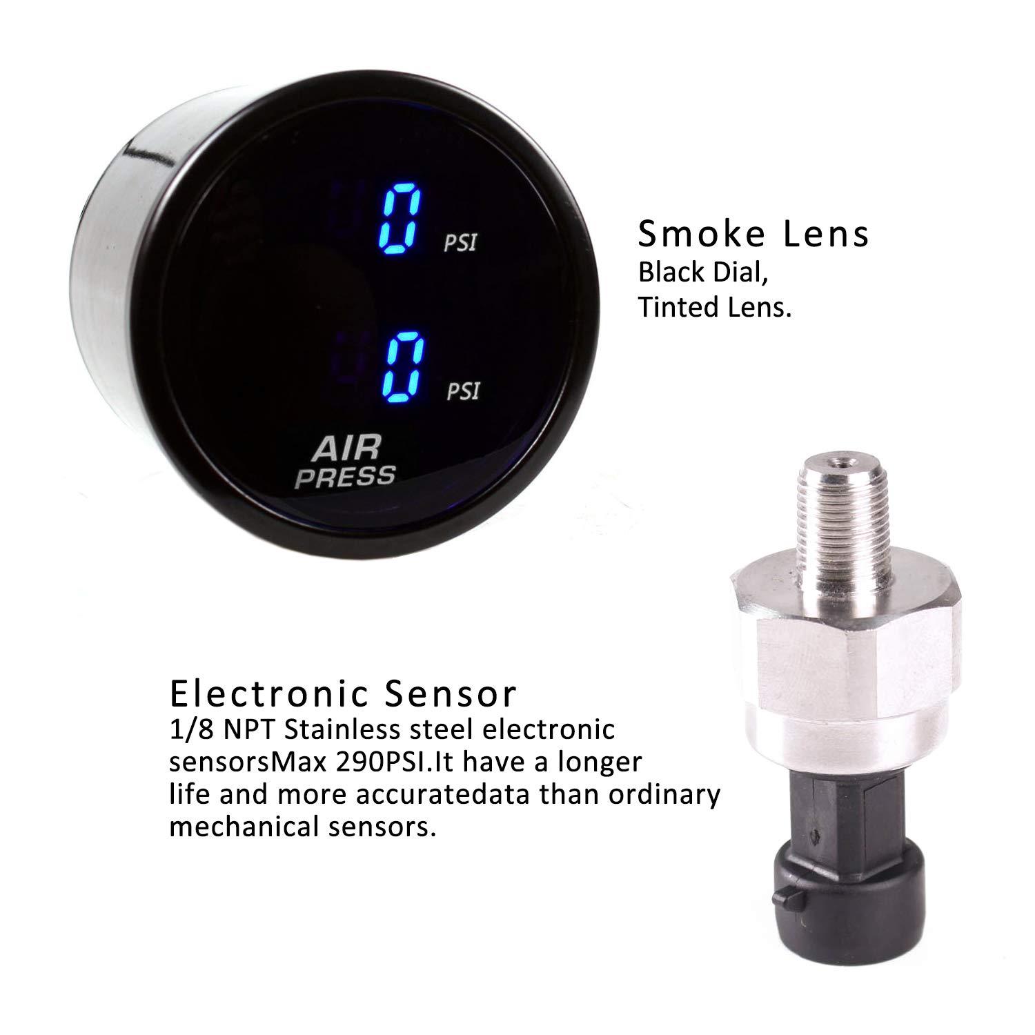 O Kit de Manômetro Digital de Pressão para Suspensão a Ar Dual Air Bag é a solução ideal para quem busca precisão e confiabilidade na medição da pressão do sistema de suspensão a ar do seu veículo. Com capacidade de leitura de até 290 PSI, este manômetro digital apresenta um display LED de 52mm que permite uma visualização clara e rápida dos níveis de pressão em duas seções distintas do sistema de suspensão. Equipado com dois sensores elétricos de alta qualidade de 1/8 NPT, o kit garante medições precisas e consistentes, essenciais para o desempenho ideal do seu carro.
