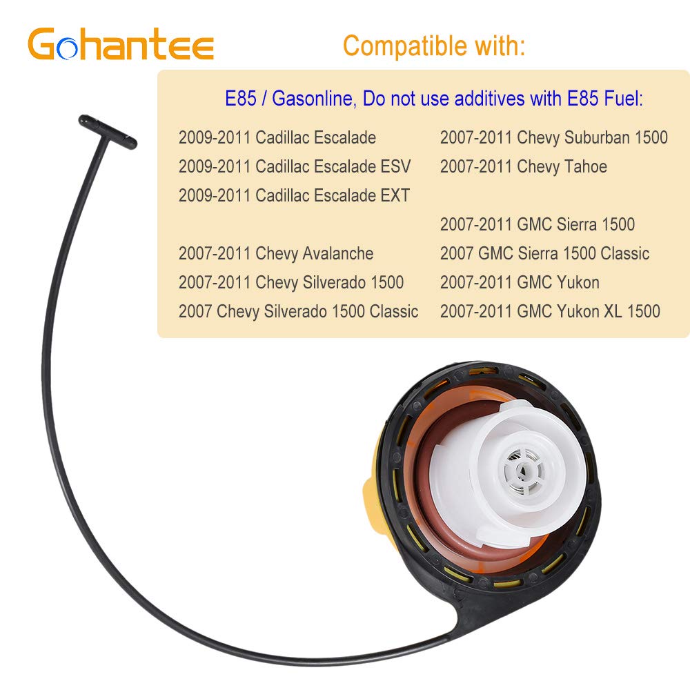 - [FITMENT]–O tampão de combustível E85 é compatível com os modelos 2009-2011 Cadillac Escalade, Escalade ESV, Escalade EXT, 2007-2011 Chevy Avalanche, 2007-2011 Chevy Silverado 1500, 2007 Chevy Silverado 1500 Classic, 2007-2011 Chevy Suburban 1500, 2007-2011 Chevy Tahoe, 2007-2011 GMC Sierra 1500, 2007 GMC Sierra 1500 Classic, 2007-2011 GMC Yukon e 2007-2011 GMC Yukon XL 1500.
