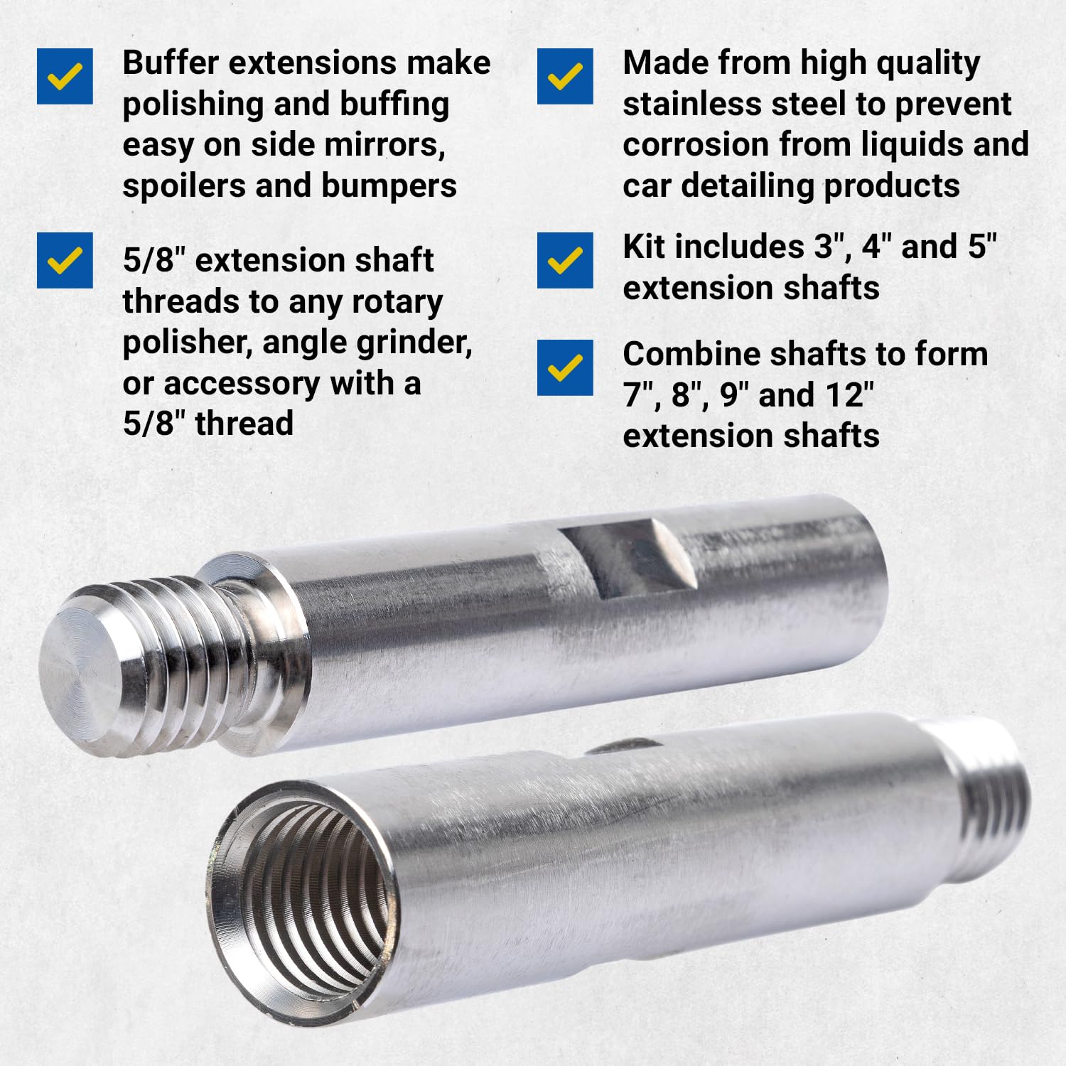 O eixo de extensão de 5/8″ se conecta facilmente a qualquer polidor rotativo, esmerilhadeira ou acessório que possua rosca de 5/8″. Fabricado em aço inoxidável de alta qualidade, o kit é resistente à corrosão causada por líquidos e produtos de detalhamento automotivo, garantindo durabilidade e desempenho superior. Além disso, a versatilidade do kit permite que você combine os eixos para formar extensões de 7″, 8″, 9″ e até 12″, adaptando-se perfeitamente às suas necessidades de polimento.