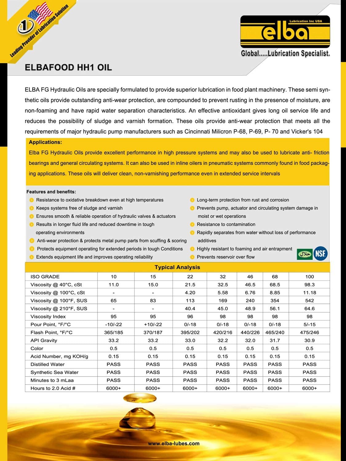 O Óleo Hidráulico Alimentício ELBA 100 é a solução ideal para sistemas hidráulicos que operam em ambientes onde a segurança alimentar é uma prioridade. Com registro NSF H-1, este fluido hidráulico é aprovado para uso em indústrias alimentícias, garantindo que não haja contaminação nos processos. Produzido nos Estados Unidos, o ELBA 100 é um óleo hidráulico de alta performance, classificado como ISO VG 100 e SAE 30, que oferece uma série de benefícios técnicos que o destacam no mercado.