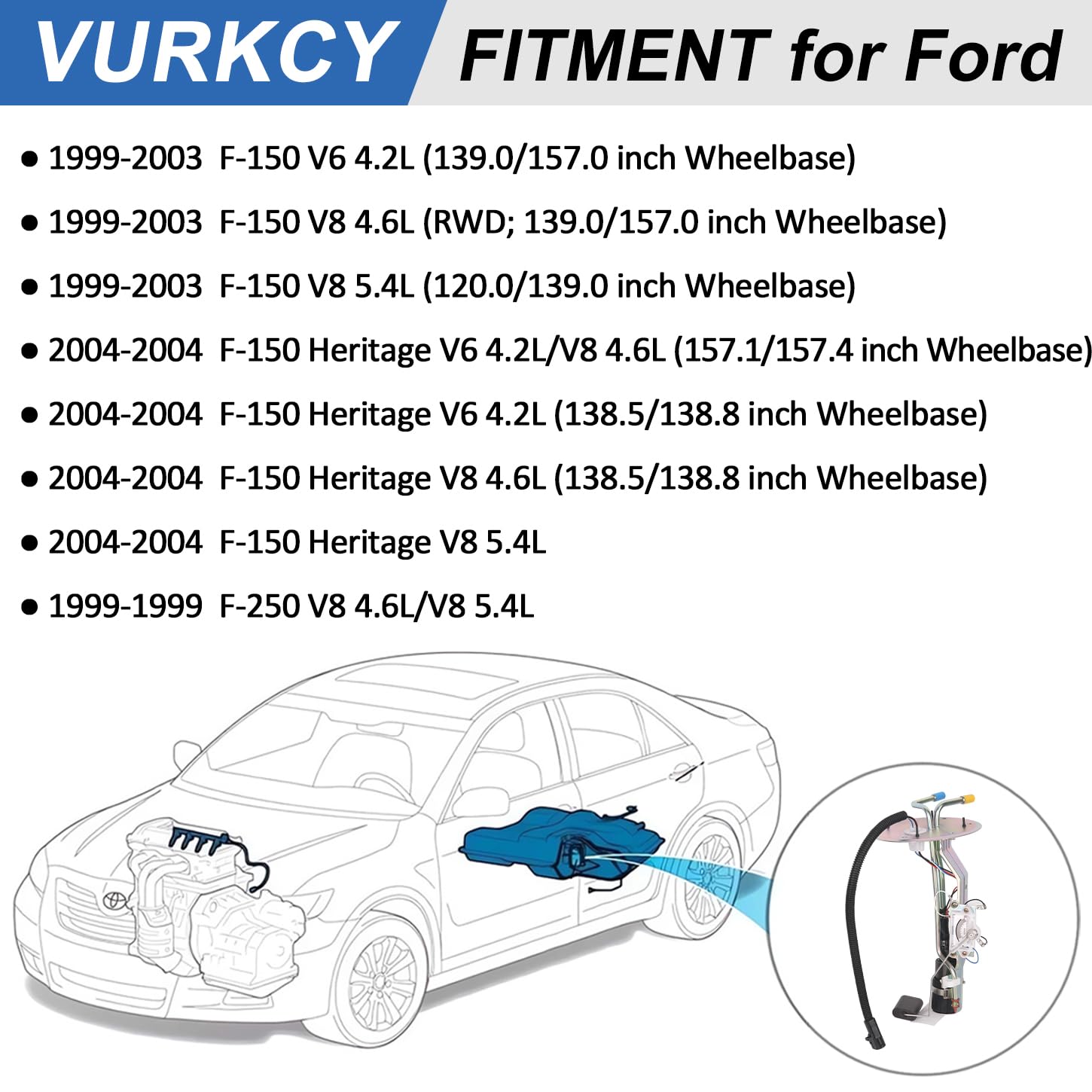 - Compatibilidade: Esta bomba de combustível é compatível com Ford F-150 (1999-2003) V6 4.2L, V8 4.6L (139.0″, 157.0″ de entre-eixos, RWD), V8 5.4L (120.0″, 139.0″ de entre-eixos); Ford F-150 Heritage (2004) V6 4.2L / 4.6L (157.1″, 157.4″, 138.5″, 138.8″ de entre-eixos), V8 5.4L; F-250 (1999) V8 4.6L/ 5.4L. Para mais detalhes, consulte a descrição.