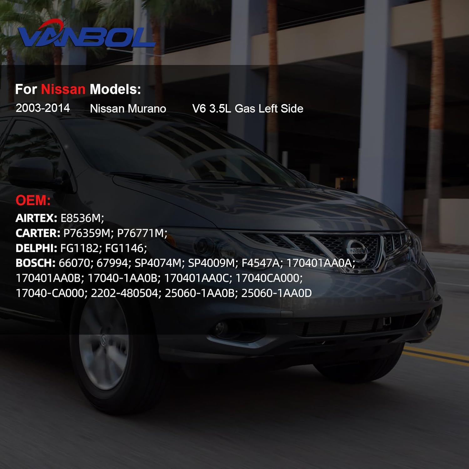 • [Compatibilidade do Veículo]: Compatível com Nissan Murano V6 3.5L Gas dos anos 2003 a 2014. Inclui O-ring do sensor de combustível. Referências OEM: VANBOL0158; AIRTEX: E8536M; CARTER: P76359M; P76771M; DELPHI: FG1182; FG1146; BOSCH: 66070; 67994; SP4074M; SP4009M; F4547A; 170401AA0A; 170401AA0B; 17040-1AA0B; 170401AA0C; 17040CA000; 17040-CA000; 2202-480504; 25060-1AA0B; 25060-1AA0D.