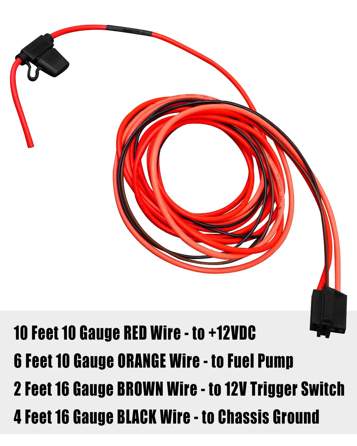 A instalação é simplificada com fios longos e claramente rotulados. O kit inclui um fio vermelho de 10 pés (10 gauge) para a bateria de +12V, um fio laranja de 6 pés (10 gauge) para a bomba de combustível, um fio marrom de 2 pés (16 gauge) para o interruptor de disparo de 12V e um fio preto de 4 pés (16 gauge) para o aterramento do chassi. Um diagrama de fiação fácil de entender acompanha o produto, garantindo que você possa realizar a instalação sem complicações.