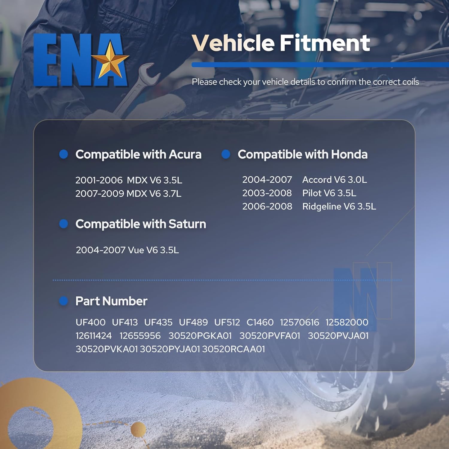 O ENA Set de 6 Bobinas de Ignição Azul é a solução ideal para quem busca desempenho e confiabilidade em veículos Honda, Acura e Saturn. Compatível com uma ampla gama de modelos, este conjunto de bobinas de ignição é projetado para atender às necessidades específicas de motores V6 de 3.0L, 3.5L e 3.7L, abrangendo os anos de 2001 a 2009. Com a ENA, você garante que seu veículo funcione com eficiência máxima, proporcionando uma ignição mais rápida e uma queima de combustível mais eficiente.