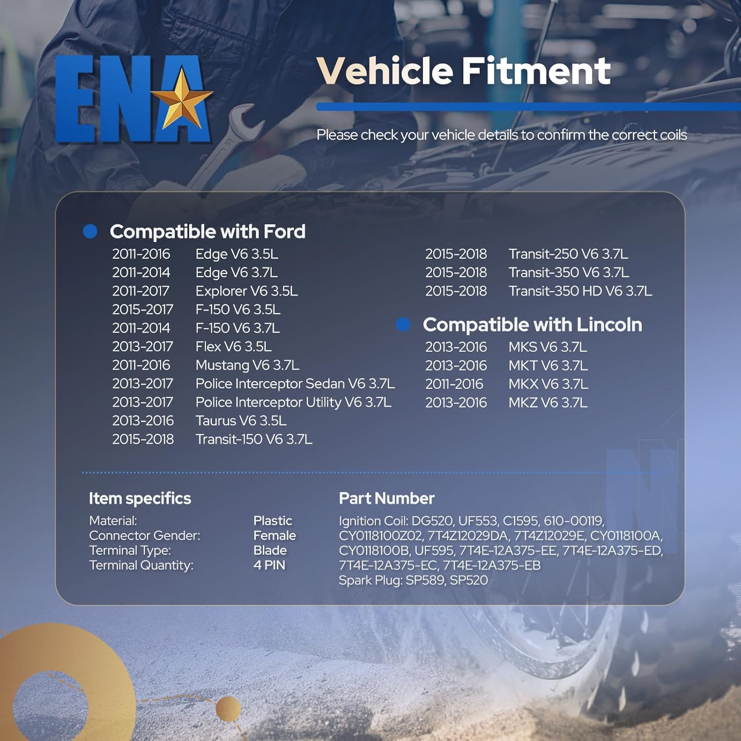 O ENA Set de 6 Bobinas de Ignição e 6 Velas de Ignição de Platina é a solução ideal para quem busca desempenho e confiabilidade em veículos da linha Ford e Lincoln. Este conjunto é compatível com uma ampla gama de modelos, incluindo o Ford Edge, Explorer, F-150, Flex, Taurus, Transit e os modelos Lincoln MKS, MKT, MKX e MKZ, fabricados entre 2011 e 2018. Para garantir a compatibilidade exata com seu veículo, utilize a função Amazon Confirmed Fit e insira as informações do seu carro.