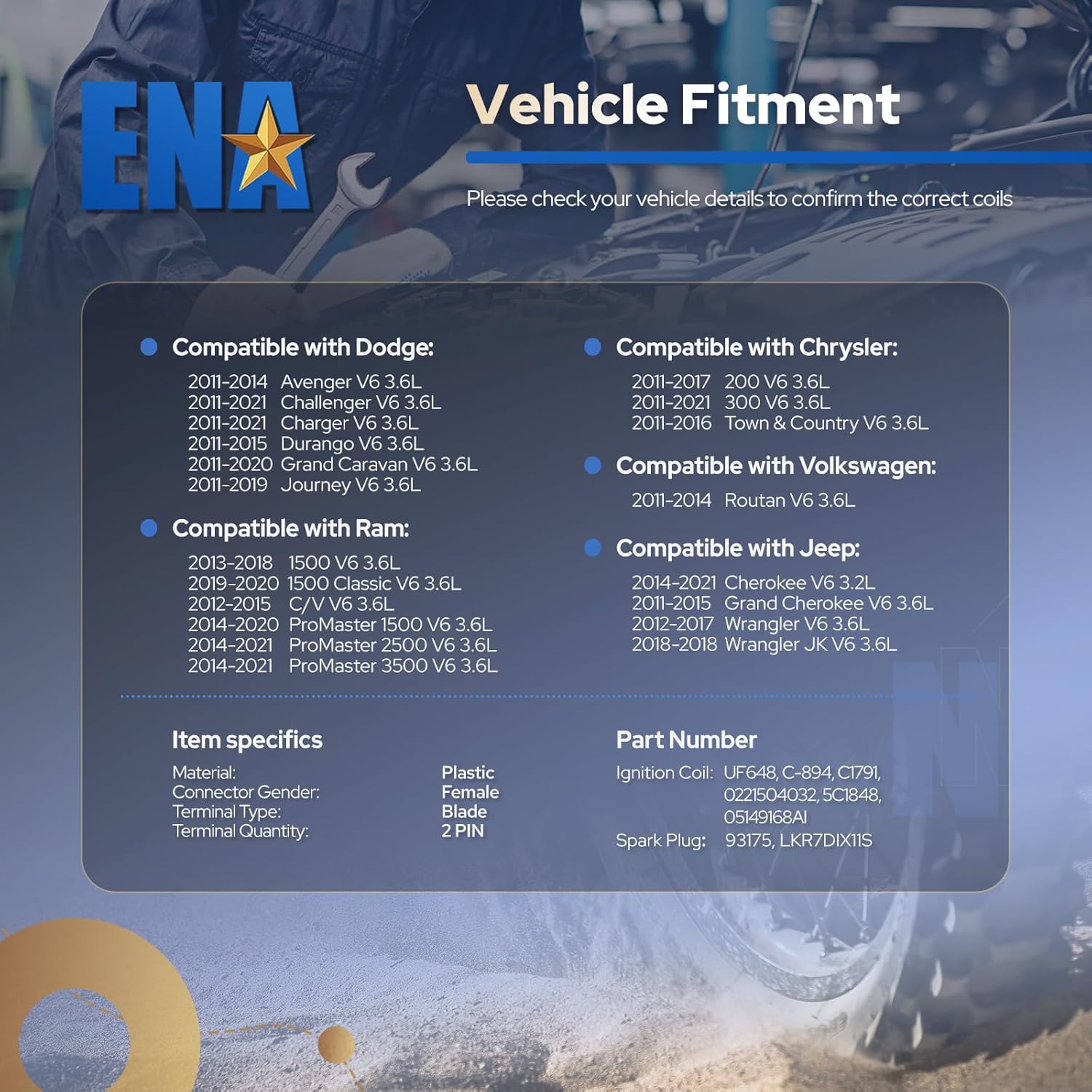 Compatíveis com uma ampla gama de modelos, as bobinas ENA atendem veículos como Chrysler 200 (2011-2017), 300 (2011-2020), Town & Country (2016), Dodge Avenger (2011-2014), Challenger (2011-2019), Charger (2011-2017, 2019-2020), Durango (2011-2015), Grand Caravan (2016-2020), Journey (2011-2019), Jeep Cherokee (2014-2020), Grand Cherokee (2011-2015), Wrangler (2012-2017), Ram 1500 (2013-2018), entre outros.