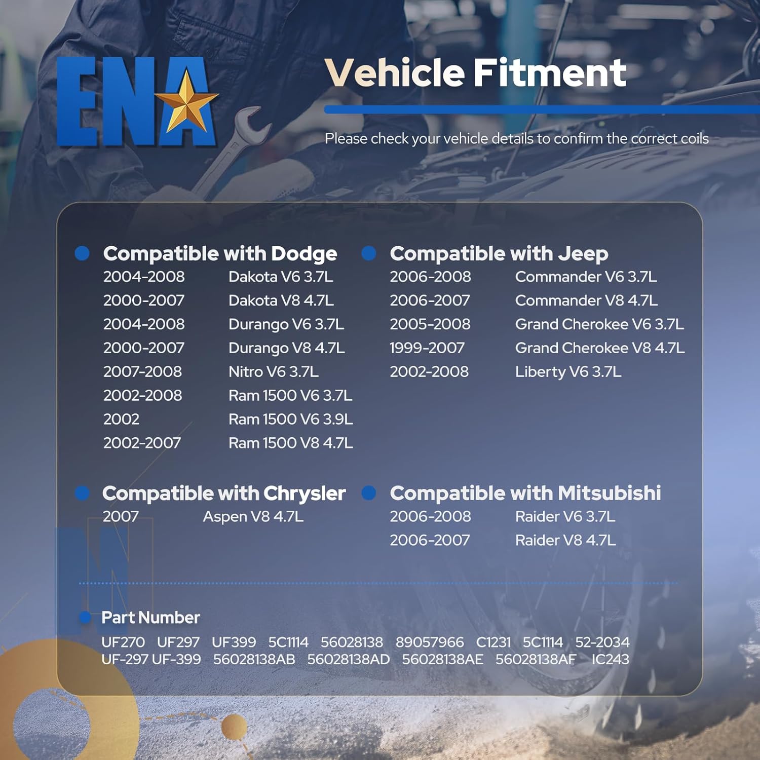 Compatíveis com uma ampla gama de modelos, as bobinas ENA são perfeitas para Chrysler Aspen 2007 4.7L, Dodge Dakota e Durango de 2000 a 2007, e Ram 1500 de 2002 a 2007. Além disso, são adequadas para Jeep Commander e Grand Cherokee de 2006 a 2007, bem como para Mitsubishi Raider de 2006 a 2007. O número da peça é um substituto para C1231, 5C1114, E232, E329, E419, 52-2034, 56028138, entre outros, garantindo que você tenha a peça certa para o seu veículo.