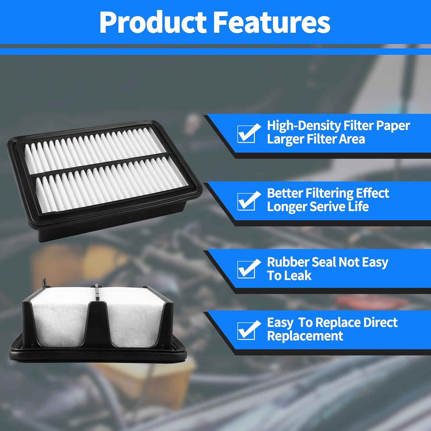 O filtro de ar do motor utiliza uma mídia filtrante fina que captura diversos detritos, evitando o desgaste excessivo do motor devido a filtros de admissão sujos. Ele não obstrui o fluxo de ar, remove partículas perigosas e melhora o desempenho do motor, aumentando a eficiência do mesmo. Para garantir que o filtro de ar do motor forneça ar limpo, recomenda-se a substituição do filtro a cada 12.000 milhas (ou conforme indicado no manual do proprietário).