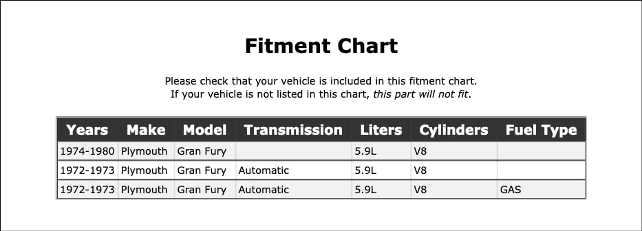 – Compatibilidade: Projetado especificamente para Plymouth Gran Fury 5.9L V8 (1972-1980)