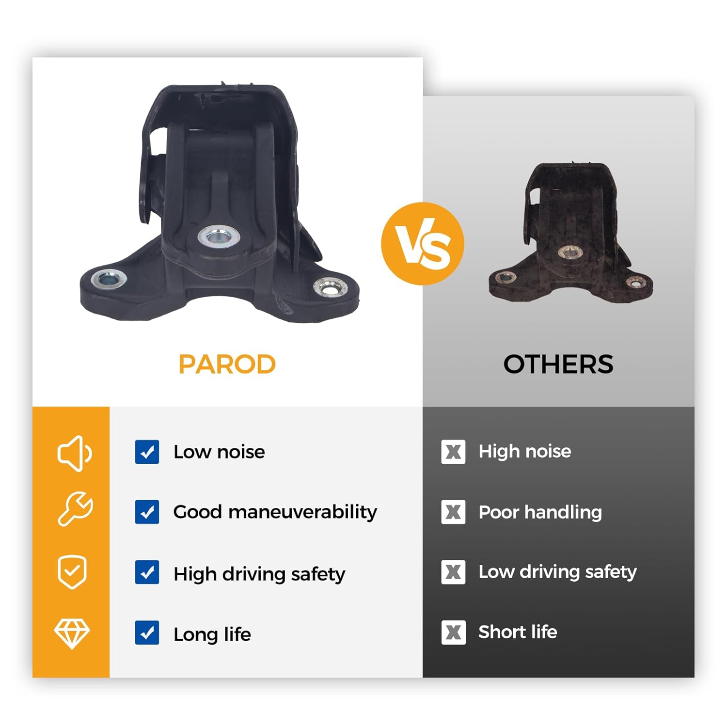 - ⏳ Durabilidade – Testadas em veículos, as Montagens do Motor PAROD garantem um encaixe adequado e excelente desempenho, resultando em uma vida útil mais longa para o usuário.