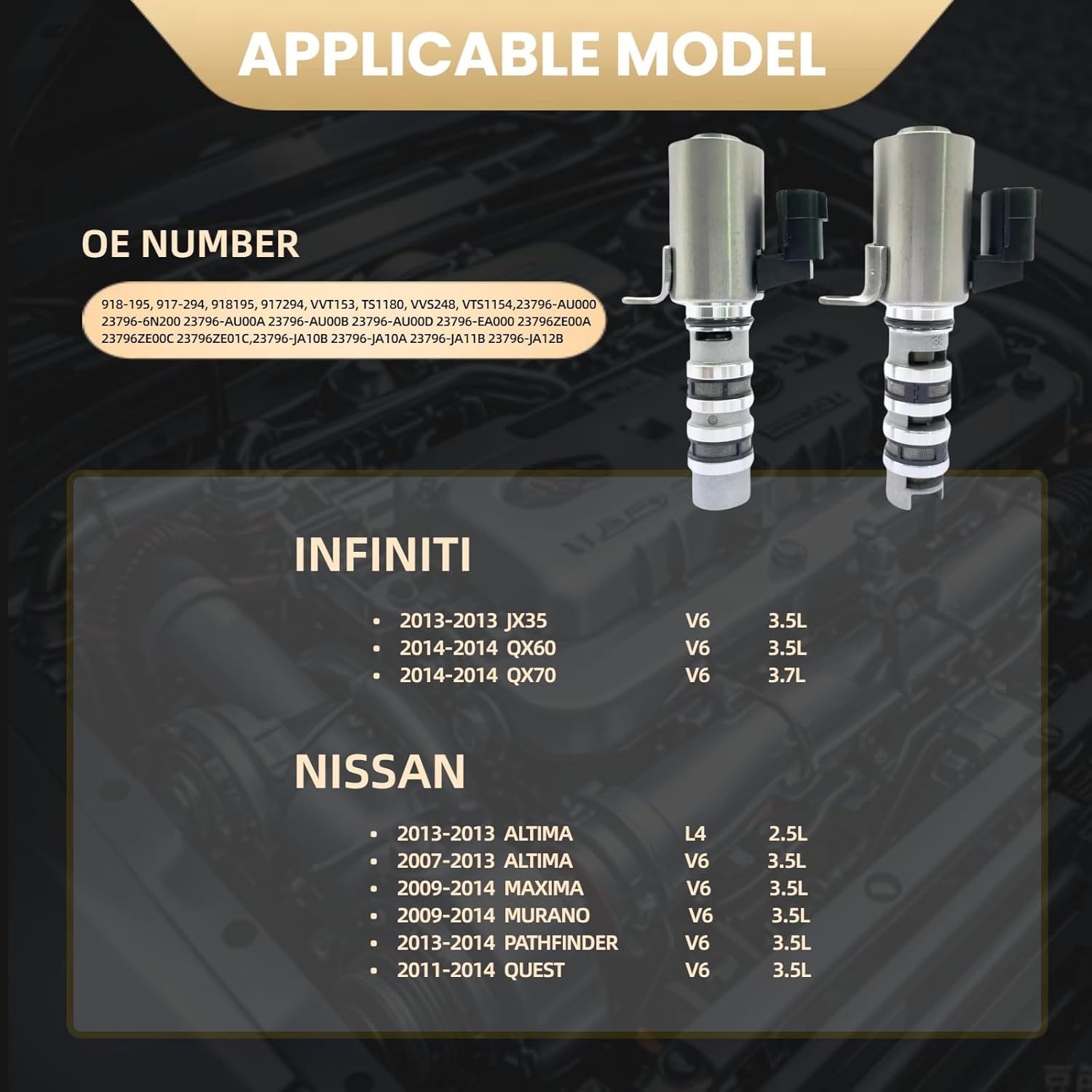 My rebuild of my Maxima continues and I chose these engine VVT Solenoids to replace the factory ones. I had researched replacing these for a while, and had also looked into getting ones from Nissan, and when I heard the price I almost changed my mind, but then I saw these and figured, why not. So far, I am happy with my choice and very satisfied with the performance. Even if there was zero change in performance, I was still thrilled as they are new parts. I highly recommend getting a professional mechanic to install these but if you are experienced in the repair, than these make a great replacement part. Unbeatable Value, 5 Stars!