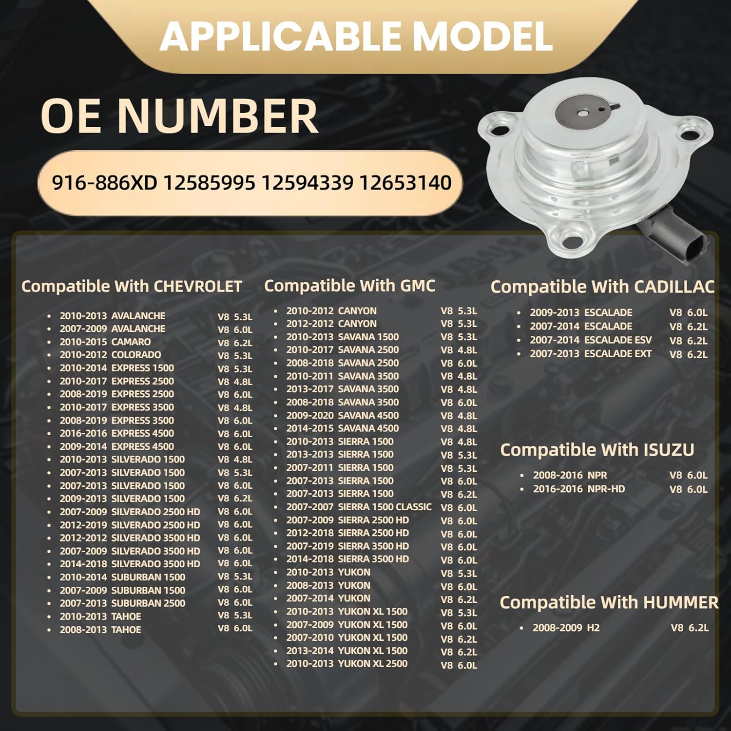 – VVT Solenoid Valve Compatível com Savana 4500 2009-2020 / Sierra 1500 2007-2013 / Sierra 2500 HD 2007-2009/2012-2018 / Sierra 3500 HD 2007-2019 / Yukon 2007-2014 / Yukon XL 1500 2007-2014