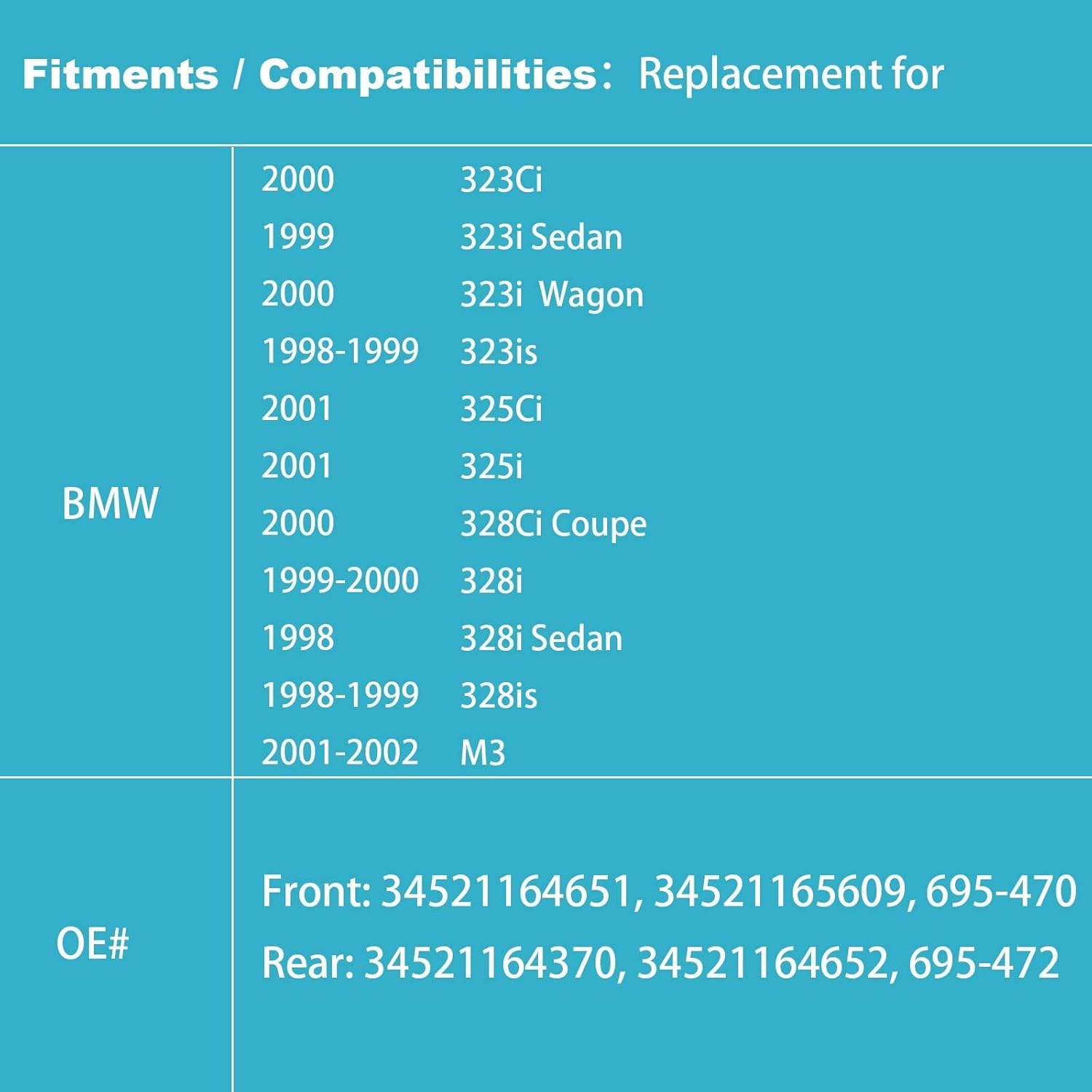 Compatível com os modelos 2000 323Ci, 328Ci, 1998-1999 323is, 1999-2000 323i, 328i, 1999 323iC, 328is, 328iC, 2001 325Ci, 325i, 330i e 2001-2002 M3, é fundamental verificar a descrição para mais informações sobre compatibilidade. Os números de peça OEM (Peça de Equipamento Original) para substituição são: Frontal 3421165609, 34521164651, 34521165609 e Traseiro 34521164370, 34521164652. Este produto é um substituto direto, garantindo um encaixe adequado e uma instalação fácil.