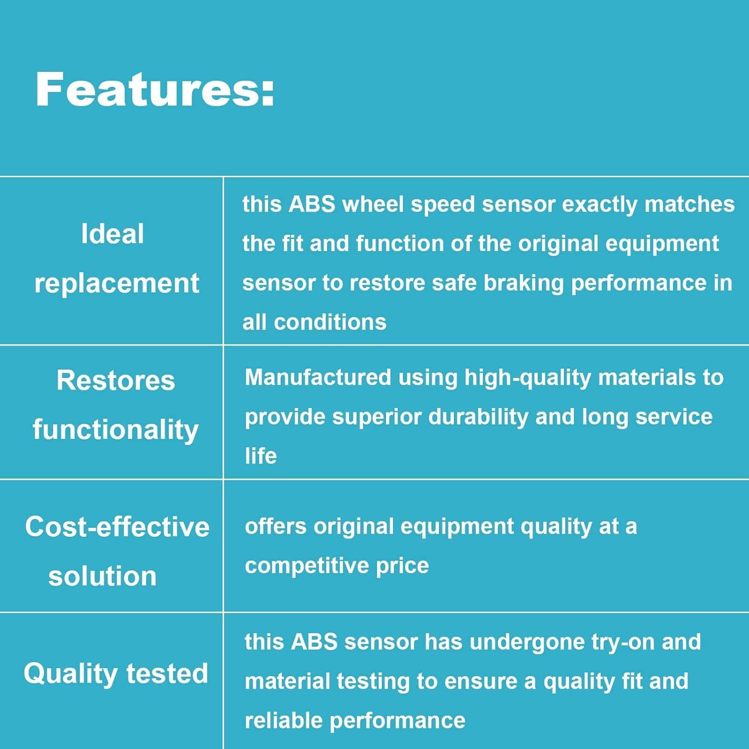 Did not work. Total waste of time and money. ABS/ASC/Brake light stayed on and then the speedometer stopped working once these sensors were installed. Upon inspection, it seems that the rear sensors are shorter than the OEM sensors and are not picking up the signal from the tone ring. Cheap chinese-made product being beta tested on amazon. Avoid.