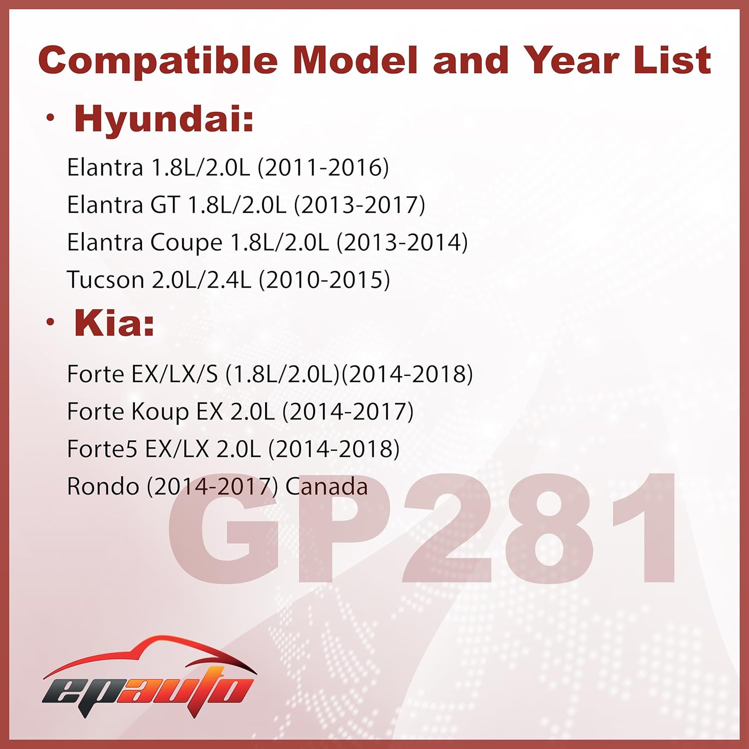 – Hyundai Elantra: 1.8L (2011-2016), 2.0L (2014-2016), Elantra GT (2013-2017), Elantra Coupe (2013-2014)
