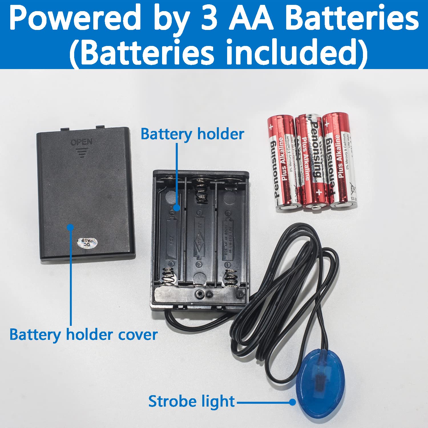 O Fake Car Alarm é alimentado por 3 pilhas AA (incluídas) e possui uma vida útil de bateria de até 1 ano com uso diário. Comparado a versões normais, a vida útil da bateria pode ser dobrada quando o interruptor é mantido ligado continuamente. O LED vermelho brilhante pisca de forma intermitente, criando uma ilusão de um sistema de segurança ativo, o que é suficiente para assustar potenciais ladrões.
