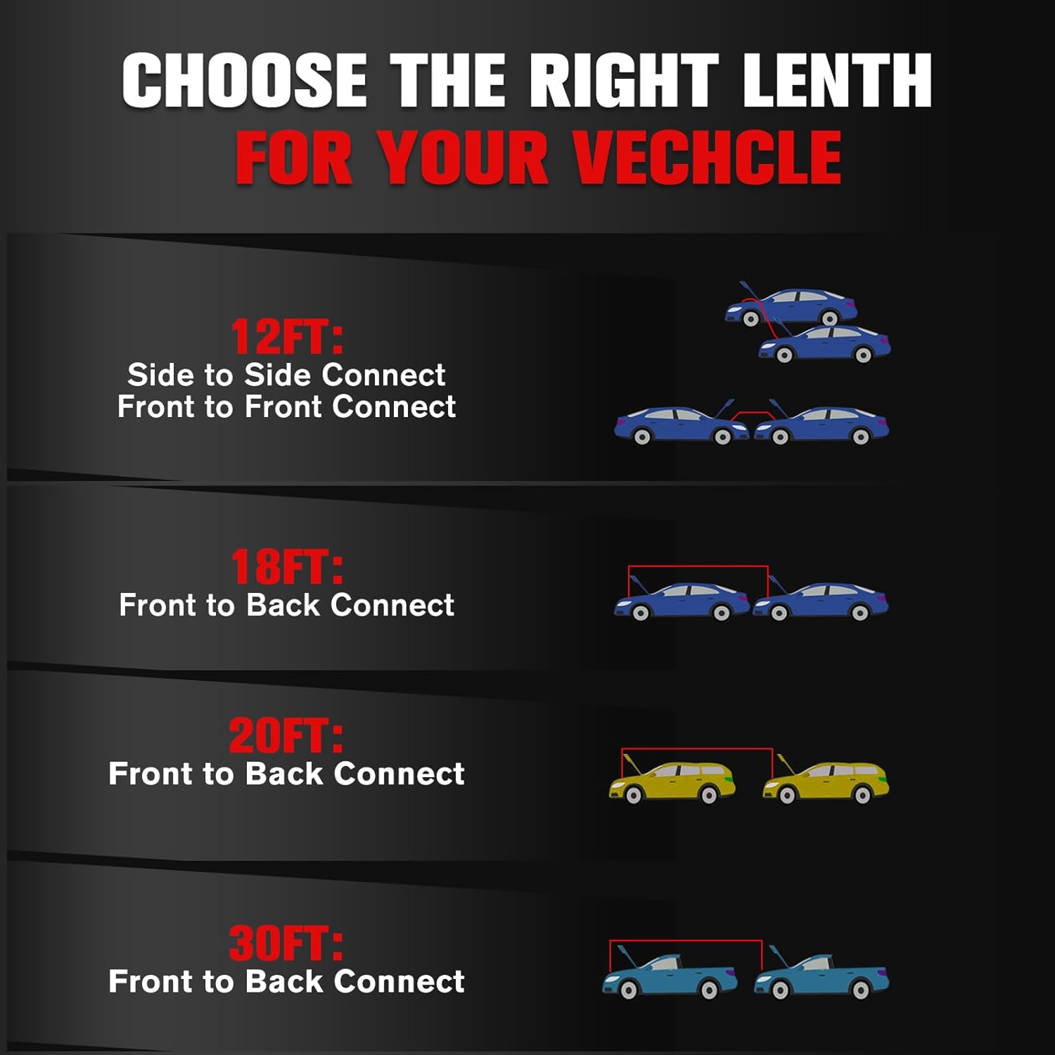 Cabelos Extra Longos para Uso Amplo: Com 30 pés de comprimento, esses cabos tornam a conexão mais fácil em uma variedade de cenários. Além disso, a FIERYRED oferece uma garantia de 2 anos, garantindo que você tenha um ajudante confiável para reanimar a bateria do seu carro.