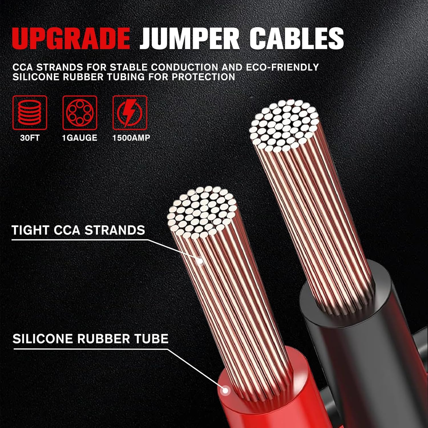 Desempenho Prominente: Os cabos de jumper de 1 gauge e 30 pés são capazes de suportar até 1500A de eletricidade instantânea, tornando-os ideais para veículos pesados e de grande porte. Seja em uma situação de emergência ou em um simples auxílio a um amigo, a eficiência desses cabos é inigualável.