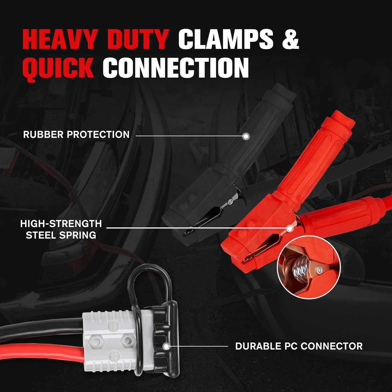 Conexão Fácil: Os grampos de alternância e os terminais de cabo de cobre proporcionam uma conexão firme às baterias dos veículos, assegurando uma condutividade superior. Além disso, um par de conectores Anderson universais permite a conexão de cabos extras, estendendo o comprimento total para 30 pés, facilitando o uso em diferentes situações.