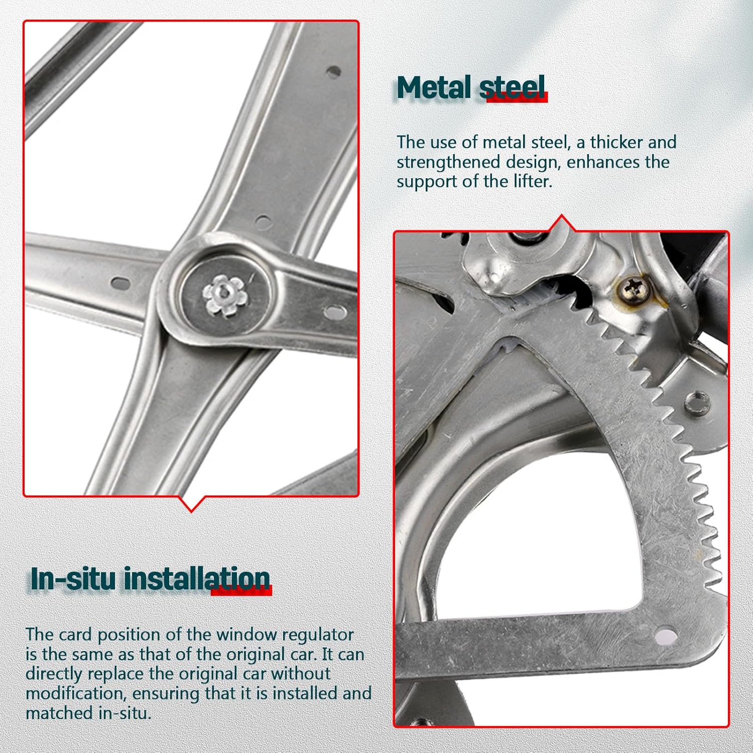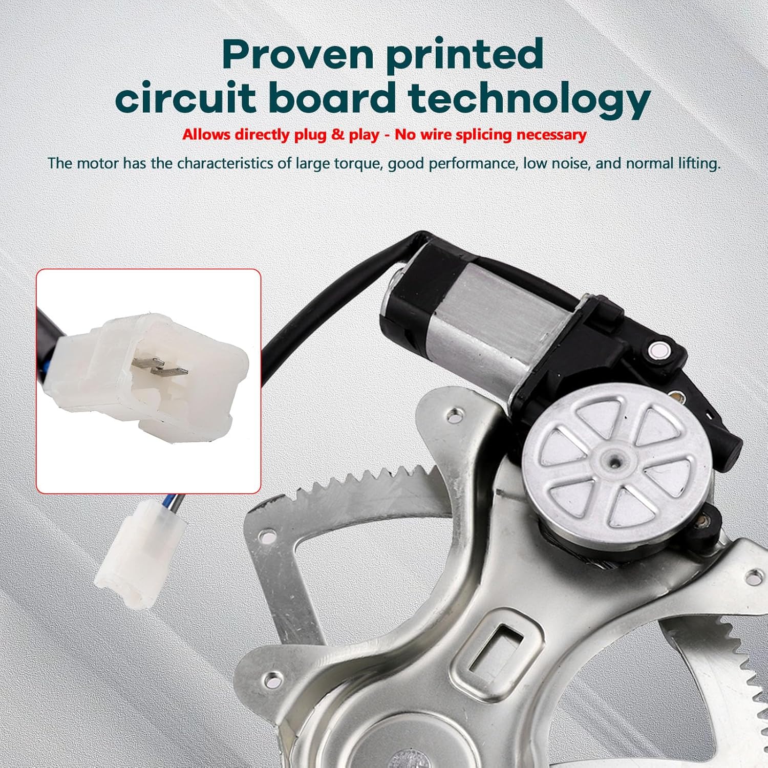 – REINFORCED COMPONENTS: O motor da janela dianteira esquerda é construído com fios de aço espessos e placas de aço, proporcionando uma capacidade de carga superior. Isso resulta em um produto robusto e resistente, que opera de maneira suave e eficiente.