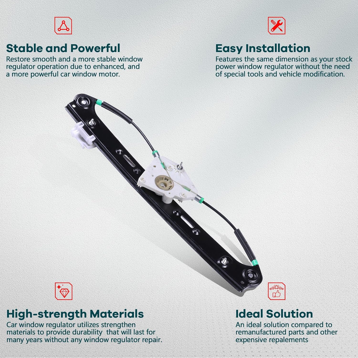 - Confiabilidade: Construído de acordo com os padrões OE, o regulador de janela elétrica desliza de forma suave e rápida, sem ruídos, e foi extensivamente testado em ciclos de milhares de vezes em portas de veículos reais para garantir sua durabilidade.