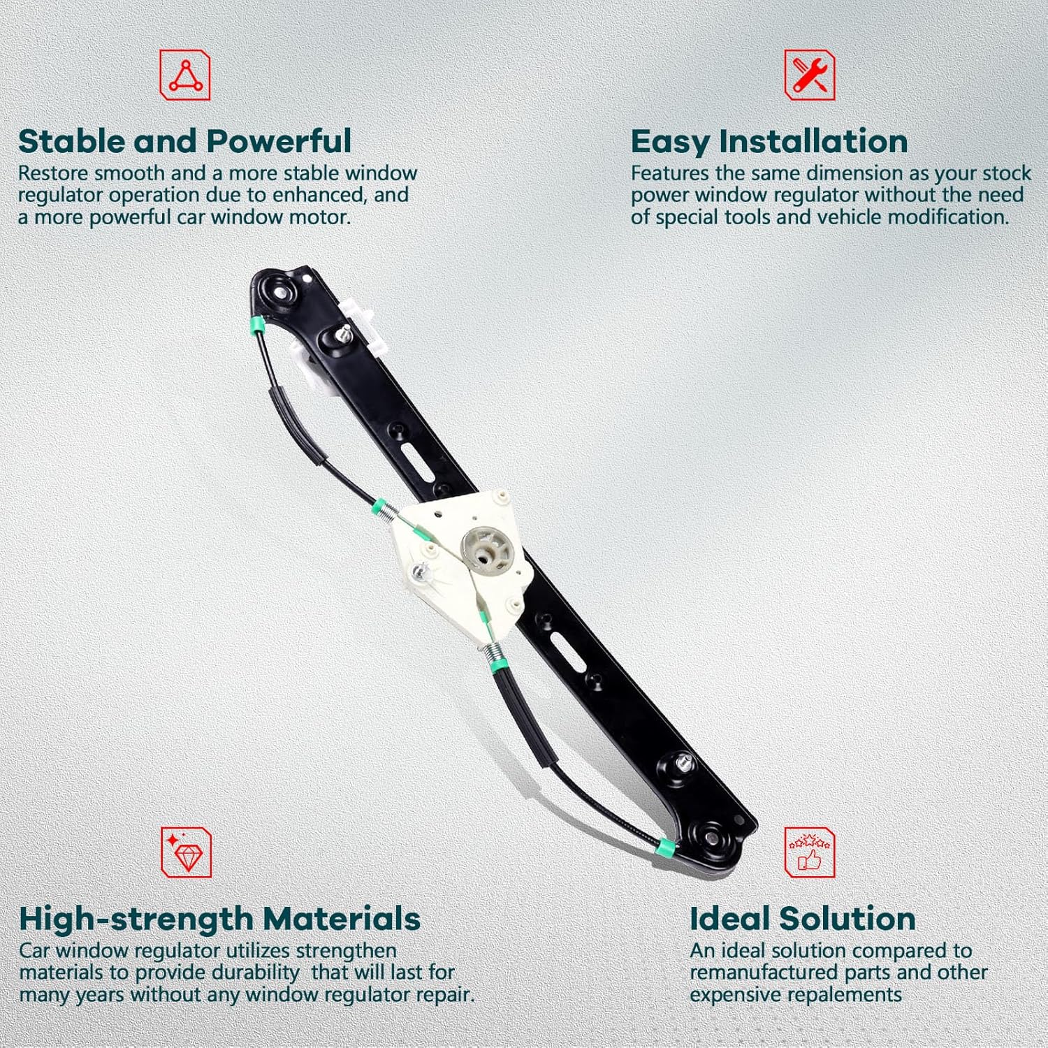 - Confiabilidade: Construído de acordo com os padrões OE, o regulador de janela elétrica desliza de forma suave e rápida, sem ruídos, e foi extensivamente testado em ciclos de milhares de vezes em portas de veículos reais para garantir sua durabilidade.