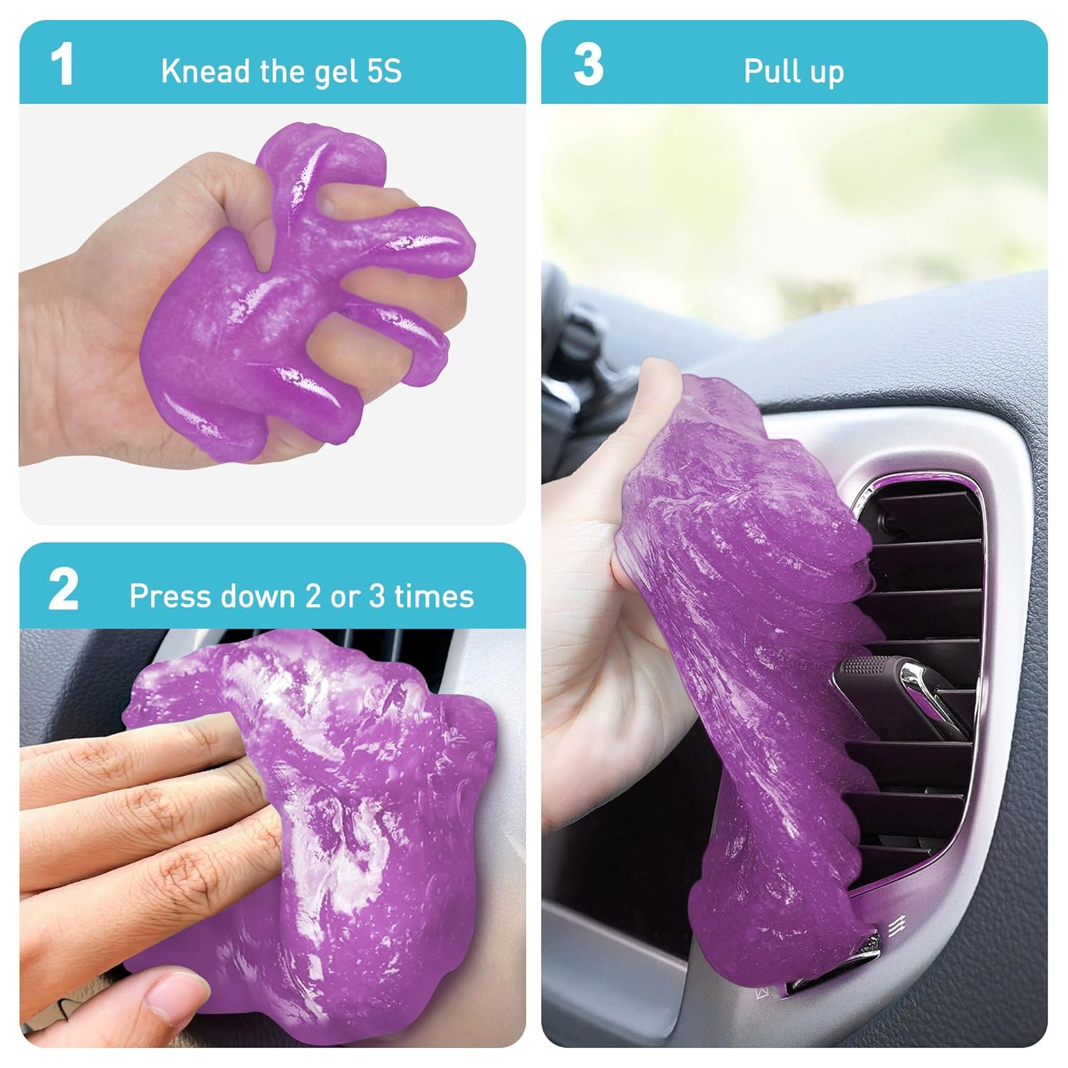 Para utilizar o gel de limpeza para carros, retire uma porção do produto e molde-o conforme necessário. Aplique na área desejada, pressione de 2 a 3 vezes e levante para capturar a sujeira e a poeira. Dobre o gel para usar o lado limpo quando necessário. Interrompa o uso se a cor do slime escurecer ou se a textura se tornar muito macia.