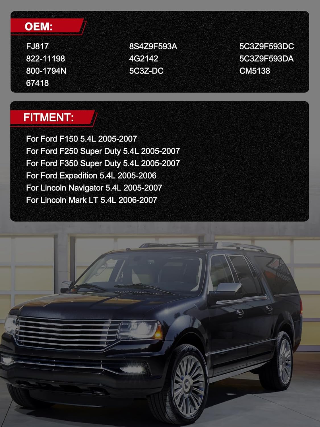 - FITMENT: Compatível com Ford F150/F250 Super Duty/F350 Super Duty 5.4L (2005-2007), Expedition 5.4L (2005-2006), Lincoln Navigator 5.4L (2005-2007) e Mark LT 5.4L (2006-2007).