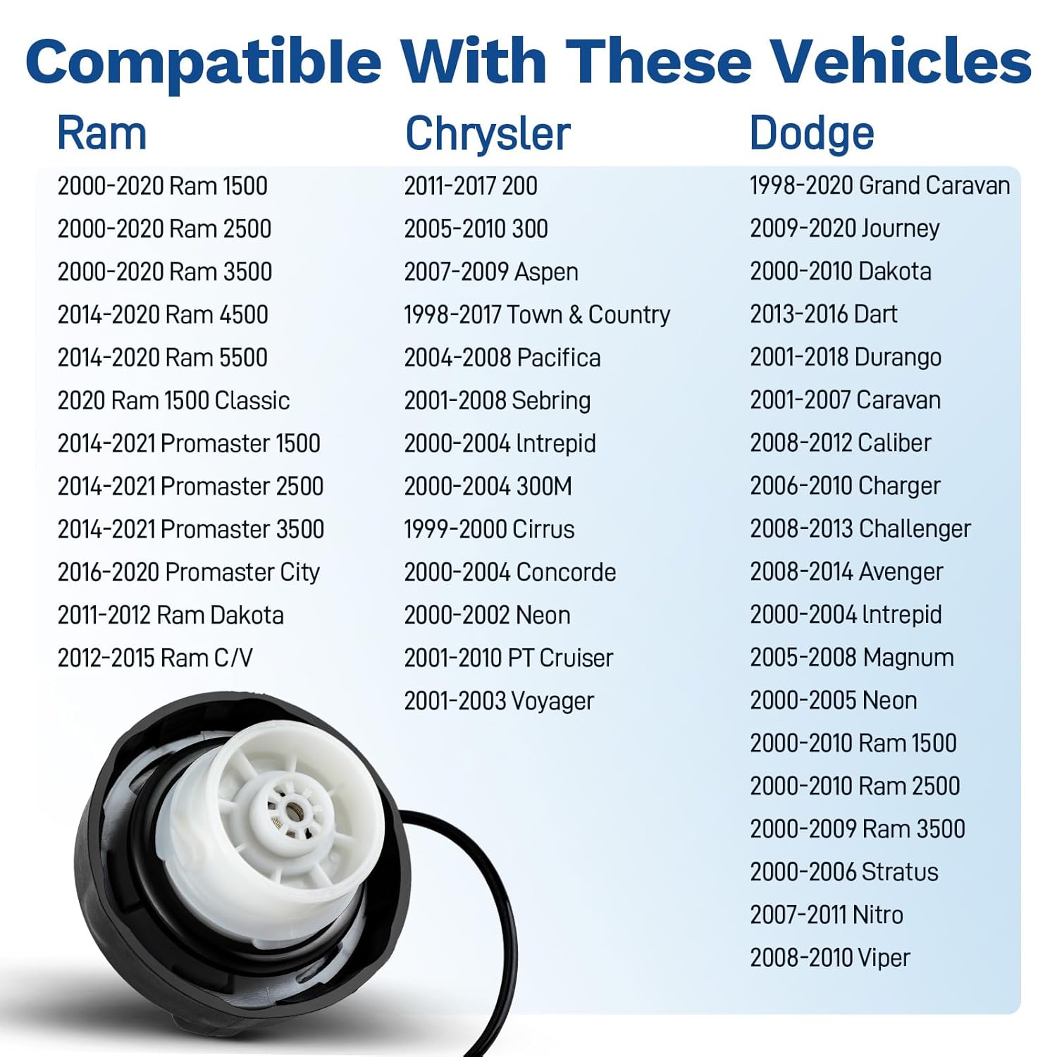 O FlyCoco Replacement Gas Cap é a solução ideal para quem busca um tampão de combustível de alta qualidade e compatível com uma ampla gama de veículos. Este produto é projetado para atender às necessidades de motoristas de modelos Dodge, Jeep e Chrysler fabricados entre 2000 e 2019, incluindo os populares Ram 1500, 2500, 3500, Jeep Wrangler JK e TJ, Grand Cherokee, Dodge Charger, Grand Caravan, entre outros.