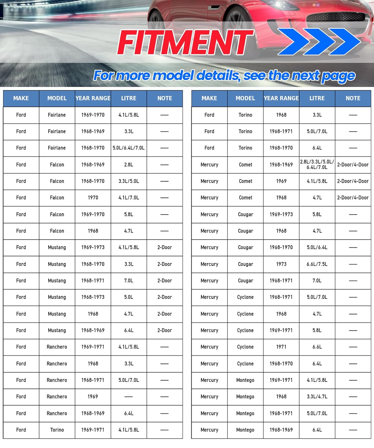 – Compatibilidade: Projetado para Ford Mustang (1968-1973), Ranchero/Torino (1968-1971), Fairlane/Falcon (1968-1970) e Mercury Comet (1968-1969), Cougar (1968-1973).
