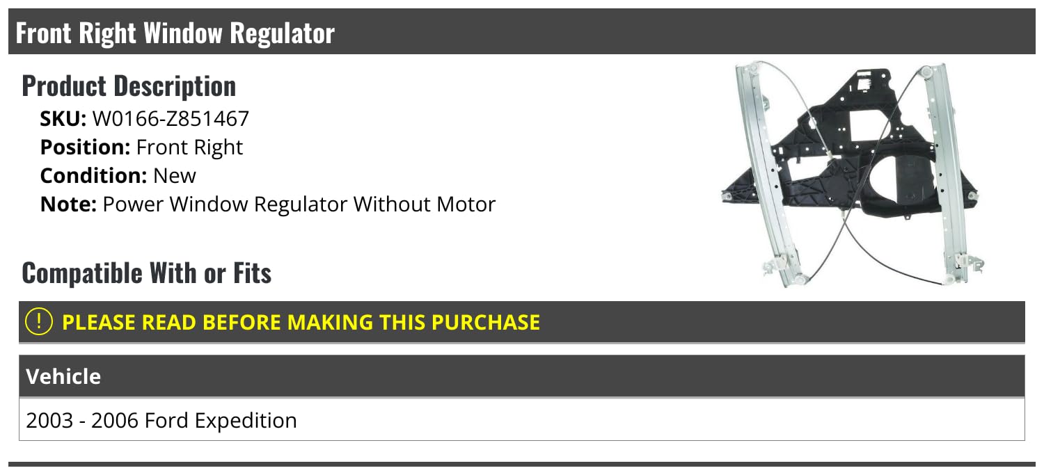 1 avaliação para Regulador de Vidro da Porta Dianteira Lado Direito – Compatível com Ford Expedition 2003-2006