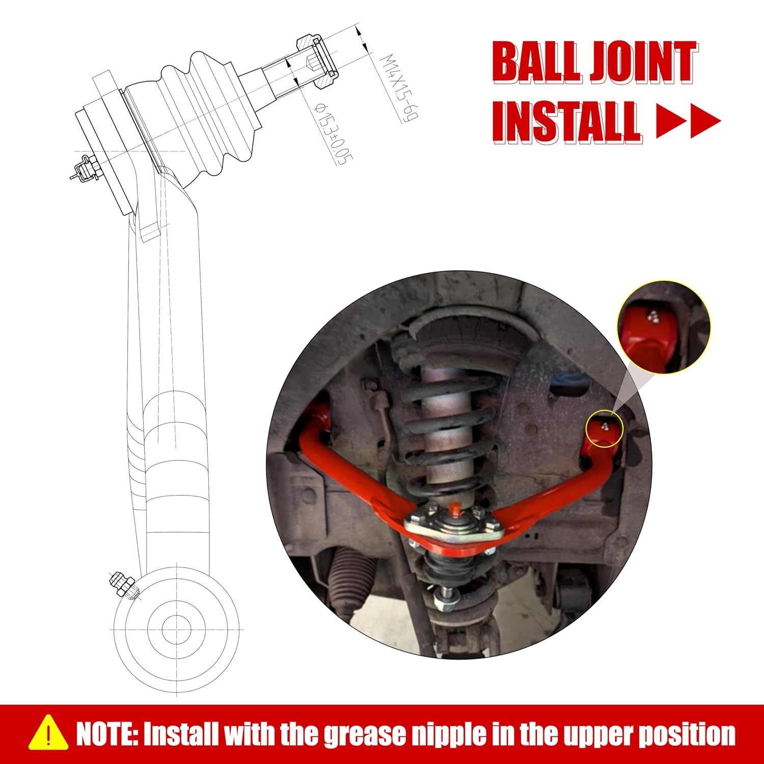 Ball Joint: removable, greasable (!) and larger in size than the OEM design. Rubber Boot is thick and large.