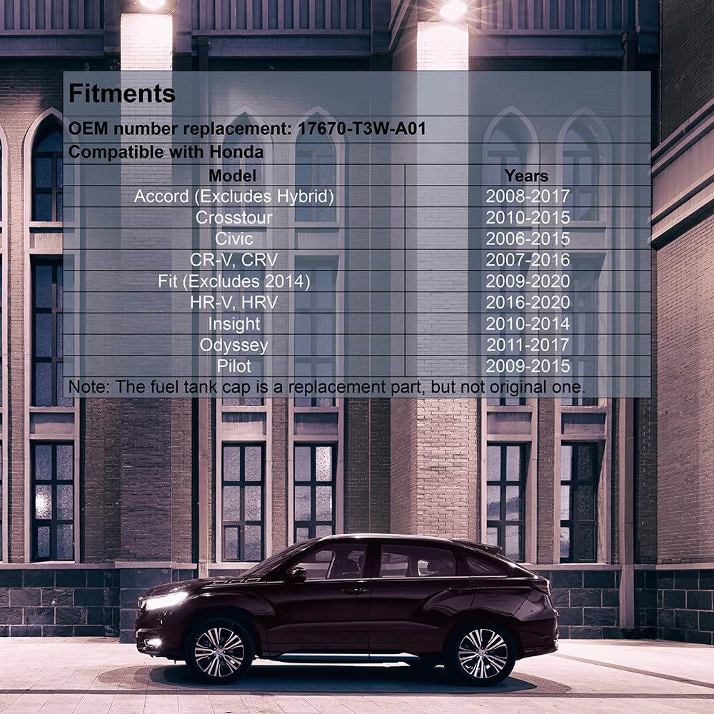 A tampa de combustível para os modelos Honda, incluindo Accord (2008-2017), Crosstour (2010-2015), Civic (2006-2015), CR-V (2007-2016), Fit (2009-2020), HR-V (2016-2020), Insight (2010-2014), Odyssey (2011-2017) e Pilot (2009-2015), é uma peça essencial para garantir a eficiência e segurança do seu veículo. Com o número de peça OEM 17670-T3W-A01, esta tampa foi projetada para se encaixar perfeitamente, substituindo diretamente a tampa original sem necessidade de adaptações.