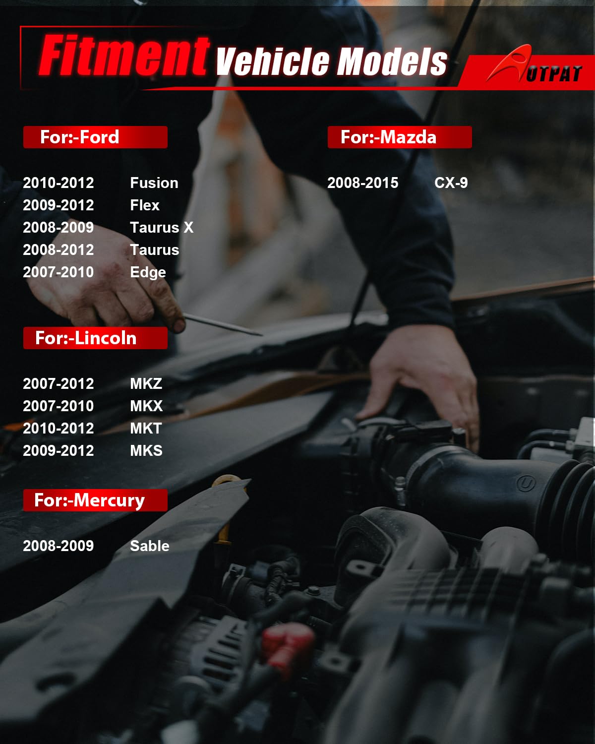 - Fitment-2: Injetores de combustível compatíveis com Lincoln MKZ 2007-2012 3.5L V6, MKX 2007-2010 3.5L V6, MKT 2010-2012 3.7L V6, MKS 2009-2012 3.7L V6, Mercury Sable 2008-2009 3.5L V6, e Mazda CX-9 2008-2015 3.7L V6.