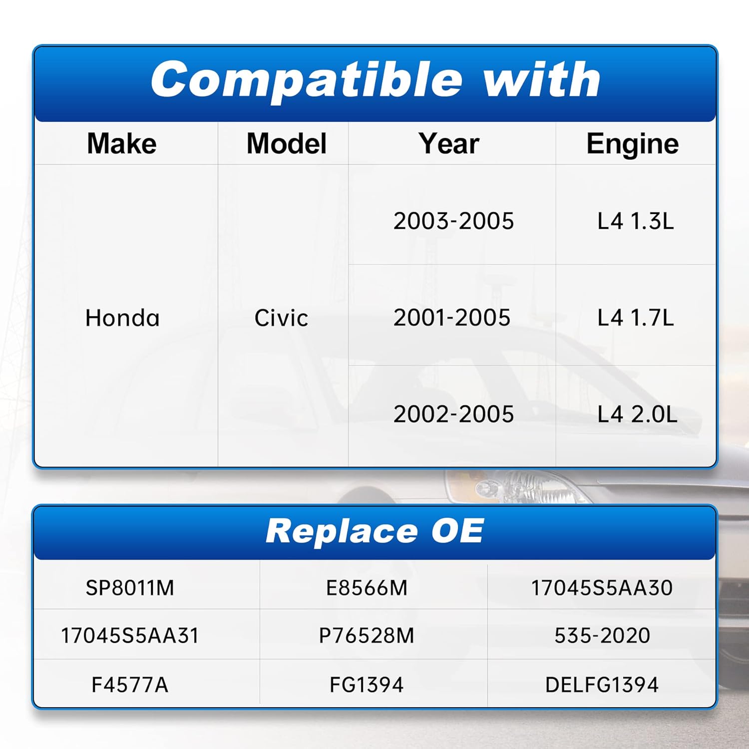 - Compatibilidade: Compatível com Honda Civic 2001-2005 1.3L; Compatível com Honda Civic 2001-2005 1.7L; Compatível com Honda Civic 2002-2005 2.0L. Utilize o seu veículo na sua garagem Amazon acima para verificar se esta peça é compatível.