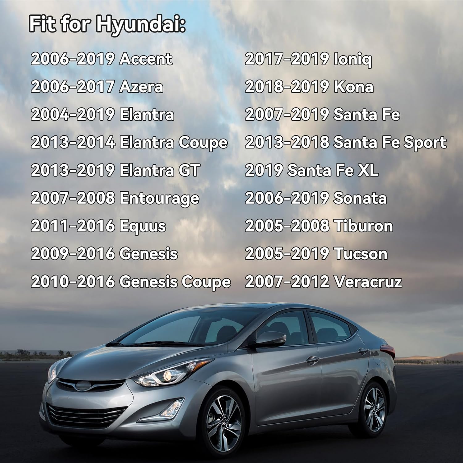 – Hyundai: 2006-2019 Accent, 2006-2017 Azera, 2004-2019 Elantra, 2013-2014 Elantra Coupe, 2013-2019 Elantra GT, 2007-2008 Entourage, 2011-2016 Equus, 2009-2016 Genesis, 2010-2016 Genesis Coupe, 2017-2019 Ioniq, 2018-2019 Kona, 2007-2019 Santa Fe, 2013-2018 Santa Fe Sport, 2019 Santa Fe XL, 2006-2019 Sonata, 2005-2008 Tiburon, 2005-2019 Tucson, 2007-2012 Veracruz.