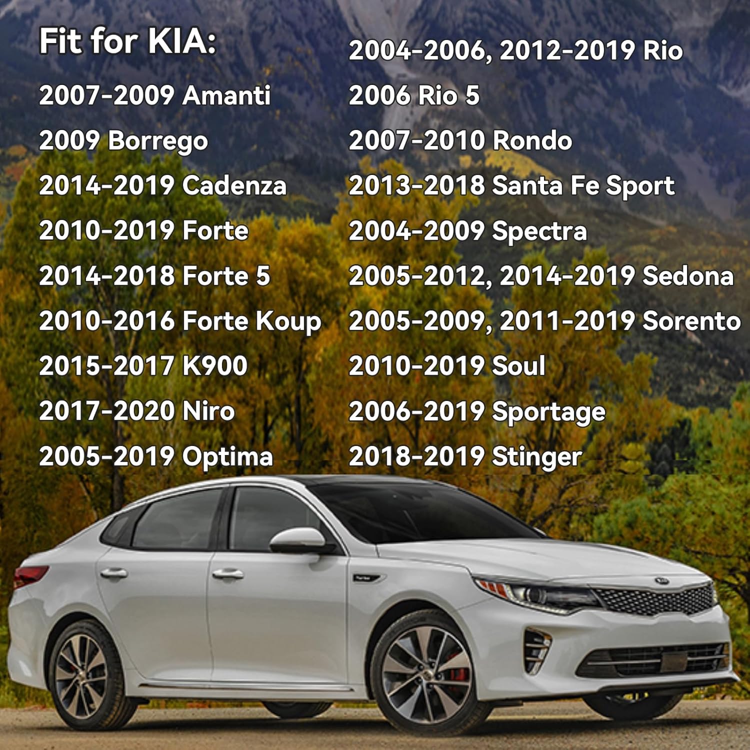 – KIA: 2007-2009 Amanti, 2009 Borrego, 2014-2019 Cadenza, 2010-2019 Forte, 2010-2016 Forte Koup, 2014-2018 Forte5, 2015-2017 K900, 2017-2020 Niro, 2005-2019 Optima, 2004-2006 Rio, 2012-2019 Rio, 2006 Rio5, 2007-2010 Rondo, 2005-2012 Sedona, 2014-2019 Sedona, 2005-2009 Sorento, 2011-2019 Sorento, 2010-2019 Soul, 2004-2009 Spectra, 2006-2019 Sportage, 2018-2019 Stinger.