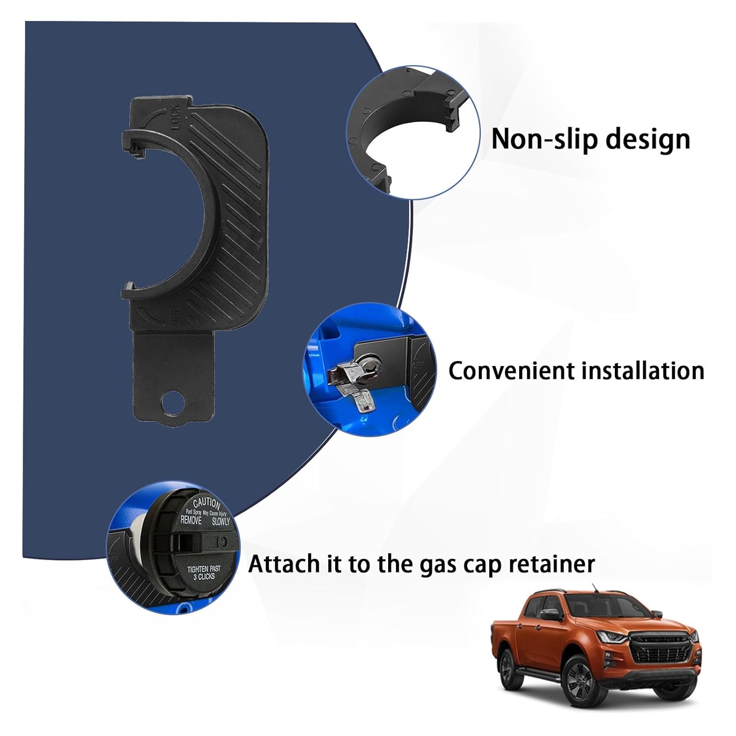 Além disso, o suporte oferece proteção profissional ao evitar que a tampa de combustível bata na lateral da caminhonete, mantendo seu veículo e tanque de combustível limpos. Com este suporte, você pode ter certeza de que seu tanque de combustível estará protegido contra poeira, sujeira e outros elementos externos, selando efetivamente o sistema de combustível e prolongando sua vida útil.