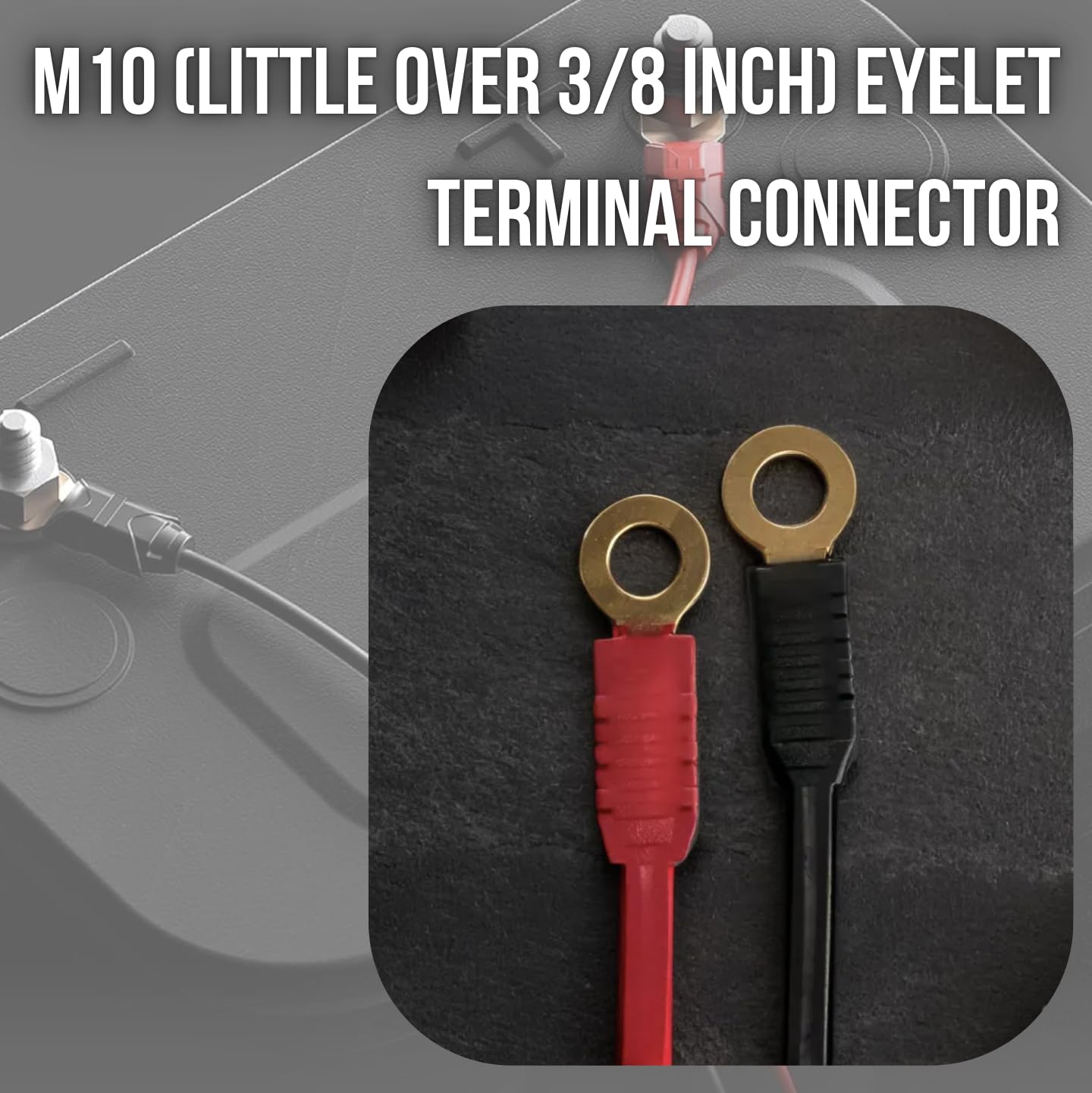 This particular set of two cables, has 3/8” / M10 ring terminals and 20 amp fuses installed. Depending on the amperage output of the charger, these fuses may be excessively large but it is easy switch to a lower current fuse if desired. Typically, charger manufacturers – including NOCO – recommend using a fuse that is twice the output of the charger – e.g. 2 amps for a 1 amp charger, 4 for a 2 amp charger, 10 for a 5 amp charger, etc. So, replace the supplied fuse(s) with one sized for your charger.