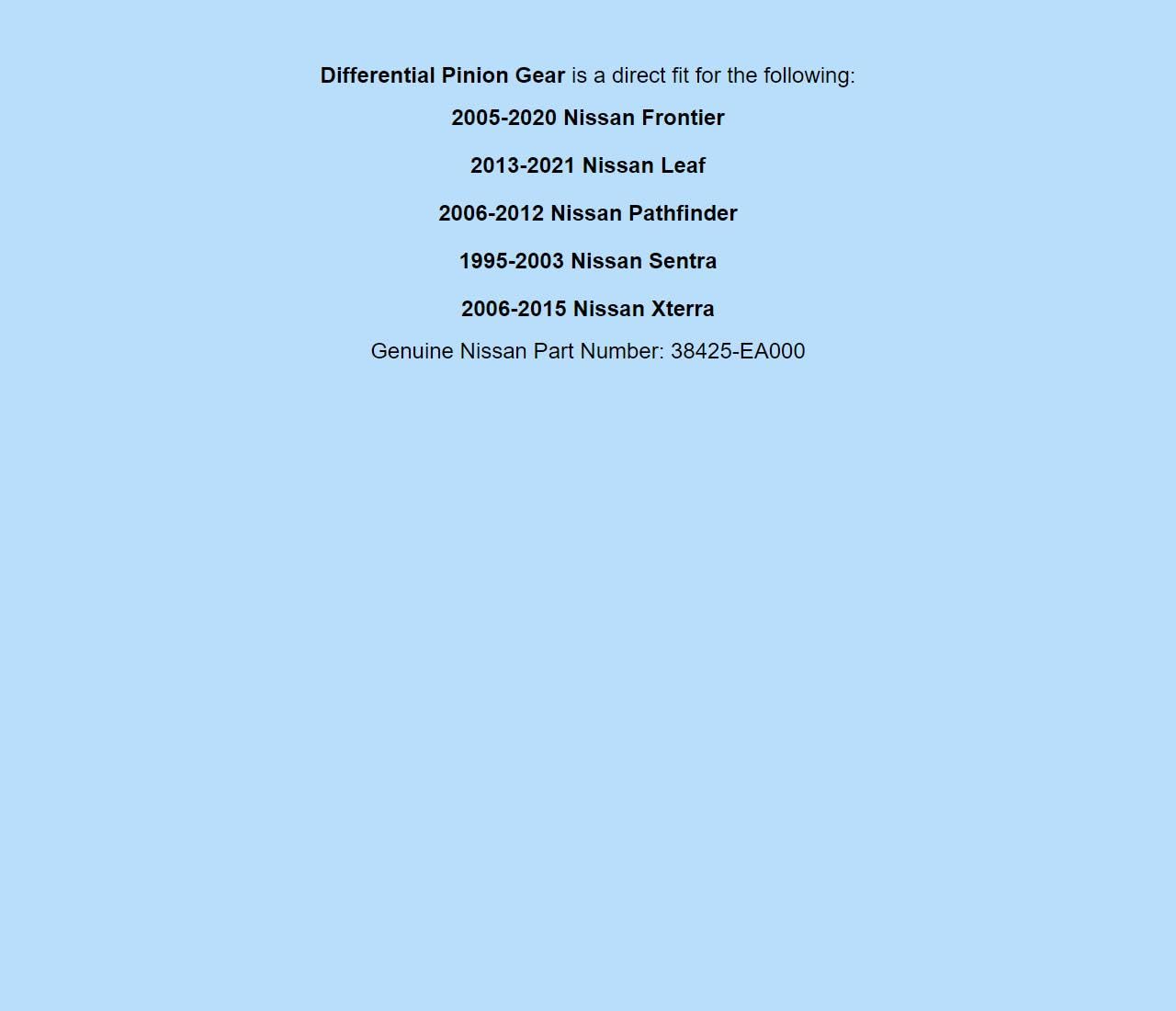 O Dente do Pinhão do Diferencial genuíno para Nissan Frontier, com o número de peça 38425-EA000, é um componente essencial para garantir o desempenho ideal do seu veículo. Este produto é uma peça genuína japonesa, projetada especificamente para os modelos de Nissan Frontier fabricados entre 1995 e 2020. A qualidade e a precisão deste dente do pinhão são incomparáveis, proporcionando uma durabilidade superior e um funcionamento suave do sistema de diferencial.