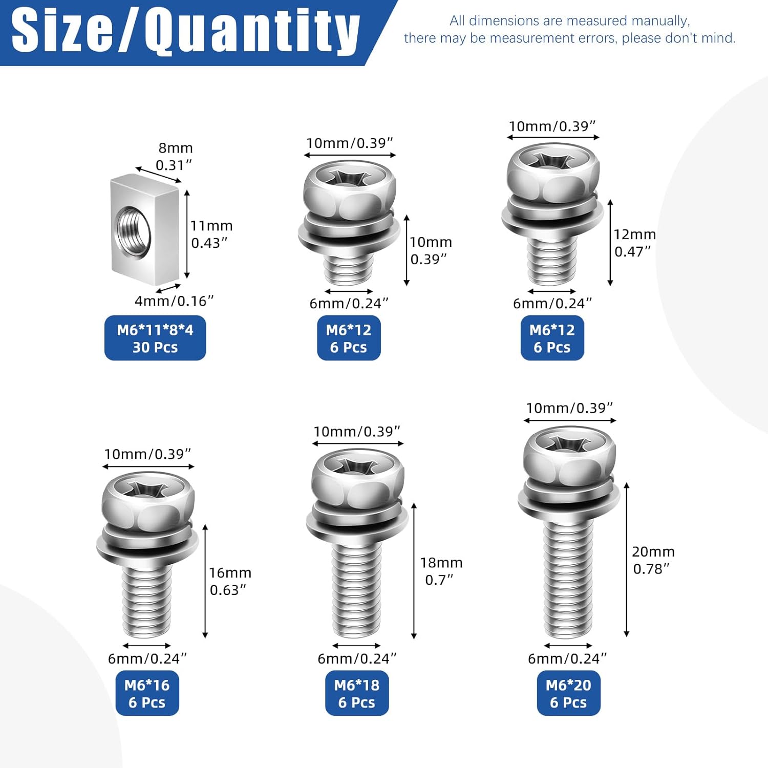 – Tamanhos dos Parafusos: 5 tamanhos (m6 x 10mm, m6 x 12mm, m6 x 16mm, m6 x 18mm, m6 x 20mm).