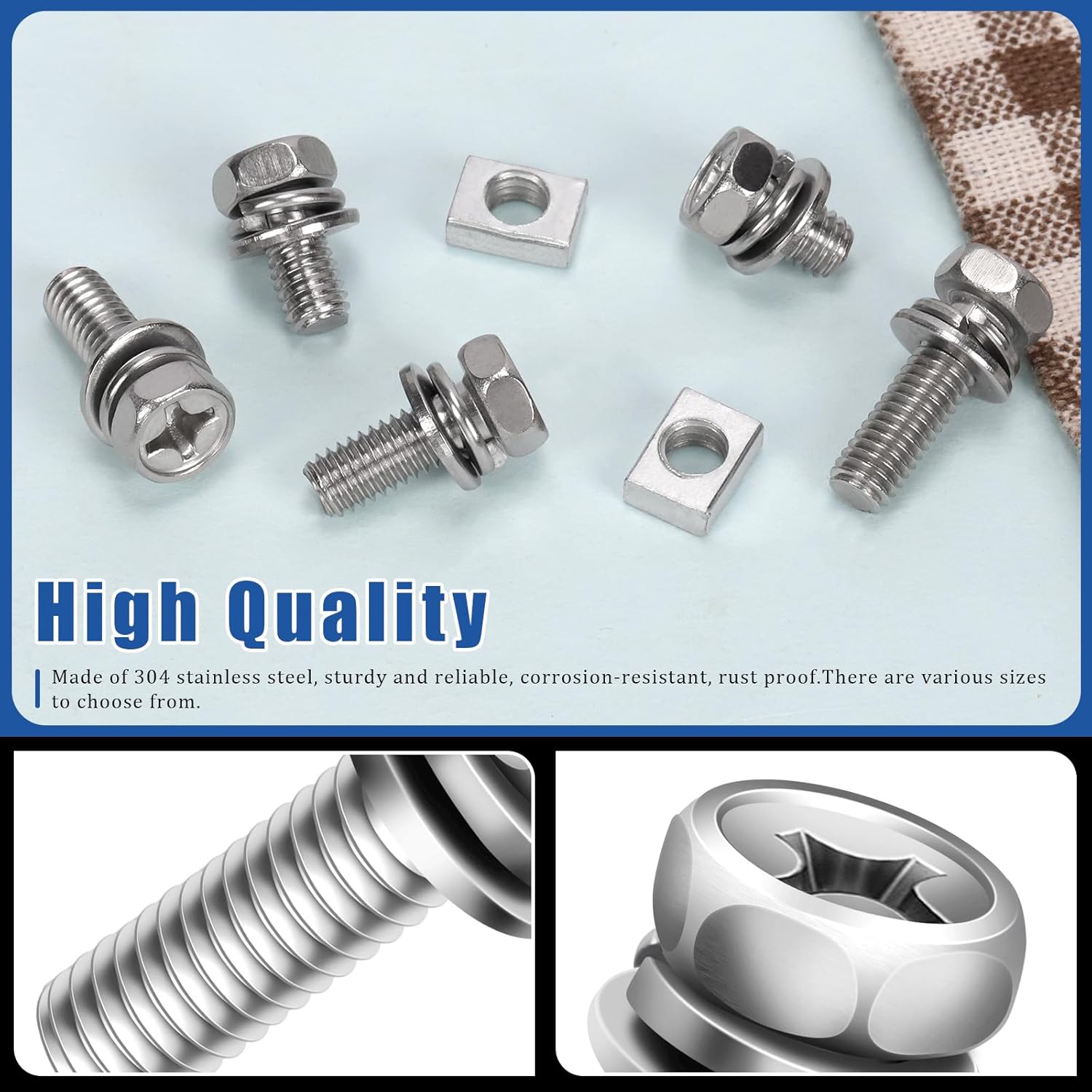 Os parafusos são fabricados em aço inoxidável 304 de alta qualidade, enquanto as porcas são feitas de aço carbono com superfície niquelada, proporcionando resistência superior à ferrugem, corrosão e oxidação. Essa durabilidade assegura que os componentes não se deformem ou quebrem, mantendo a precisão do passo da rosca e a firmeza do botão do parafuso, permitindo que você utilize o produto com total confiança.