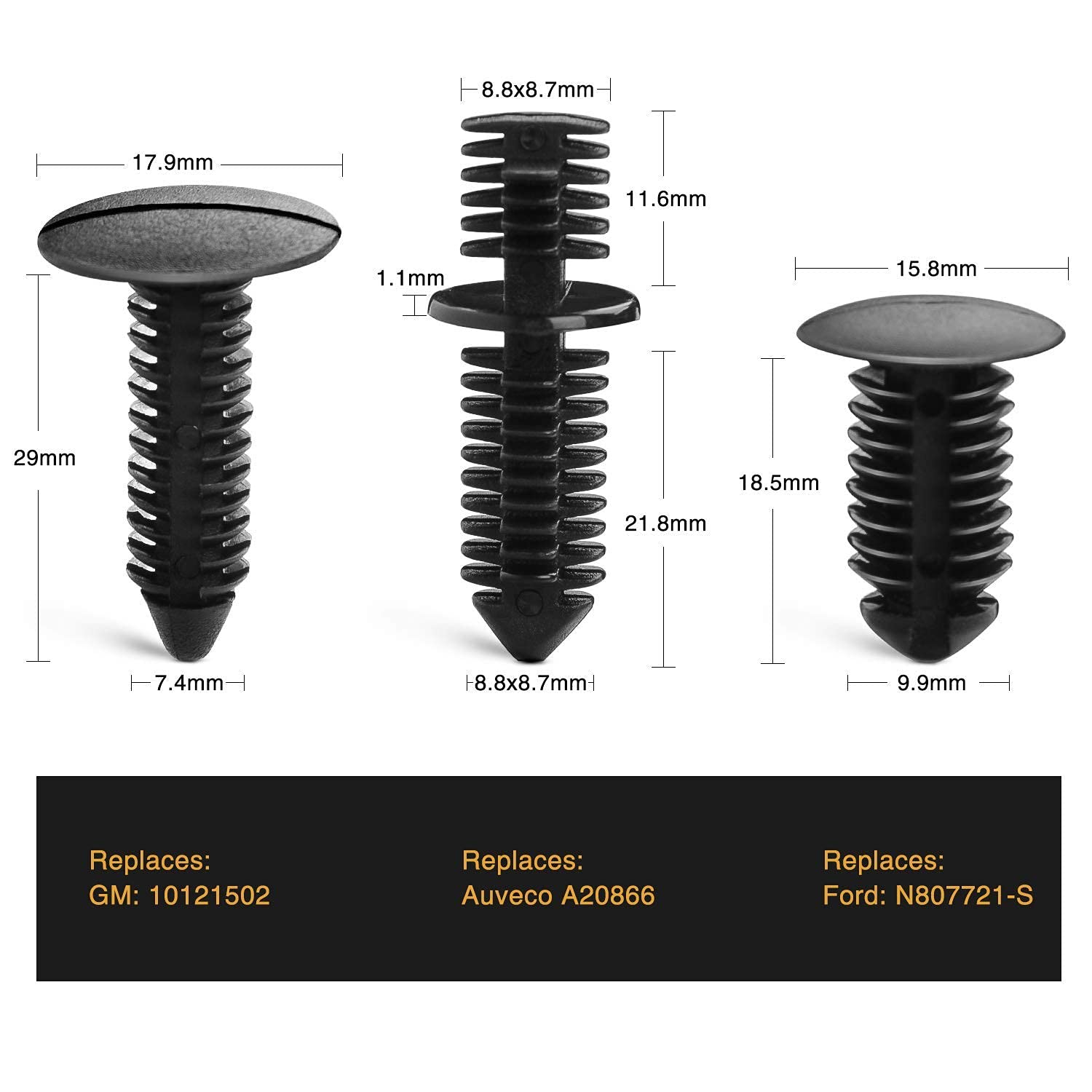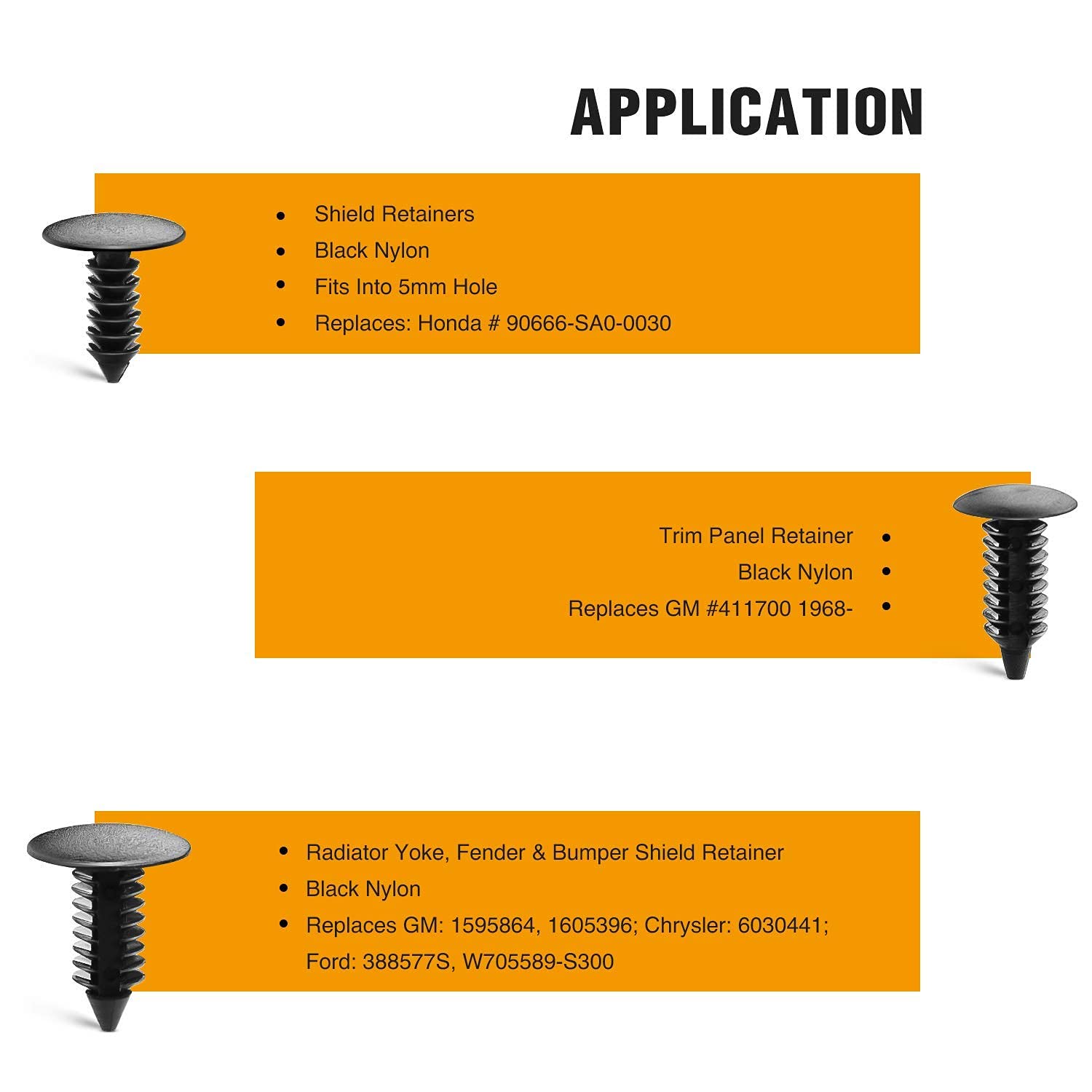 Os Shield Retainers são compatíveis com modelos Honda, substituindo a peça original # 90666-SA0-0030. Além disso, o kit inclui retentores de para-lama e escudo de para-choque que são compatíveis com veículos GM, Chrysler e Ford, como os números de substituição 1595864, 1605396, 6030441, 388577S e 390018-S, abrangendo uma ampla gama de modelos desde 1968 até os anos 90.