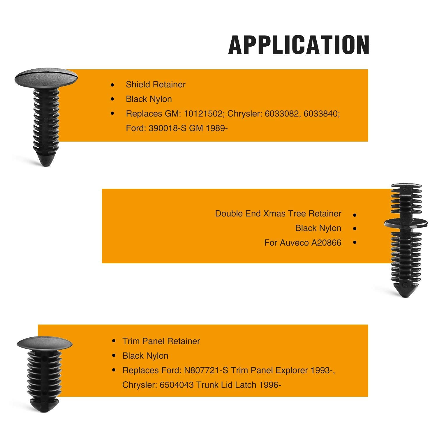 Os Double End Xmas Tree Retainers são ideais para lojas de acabamento automotivo e marinho, oferecendo versatilidade e resistência. O kit também contém Trim Panel Retainers, que substituem peças específicas para Ford e Chrysler, como o N807721-S para o Explorer de 1993 e o 6504043 para a trava da tampa do porta-malas de 1996.