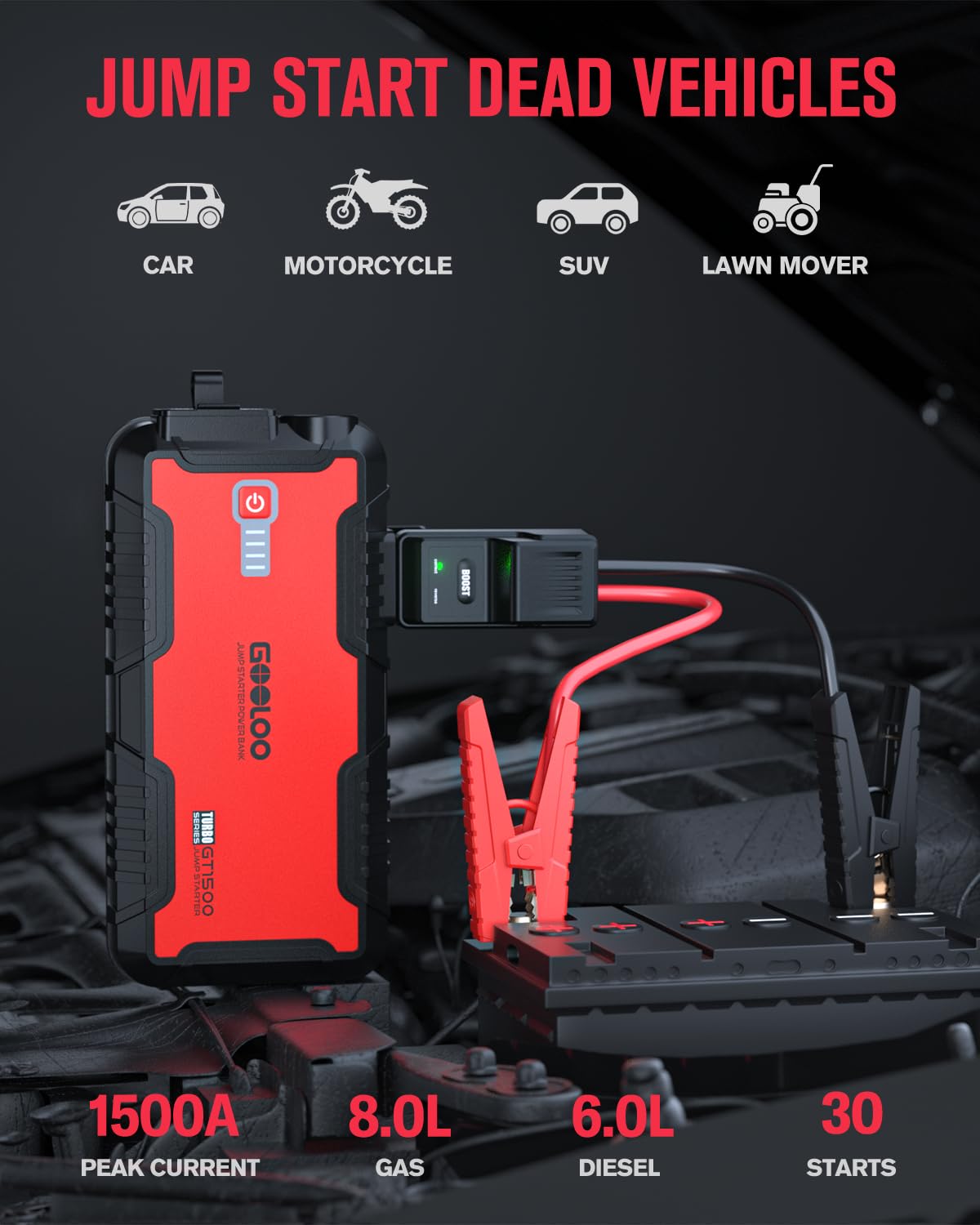 Descrição do Produto: GOOLOO Jump Starter Battery Pack – 1500A Peak Car Jump Box