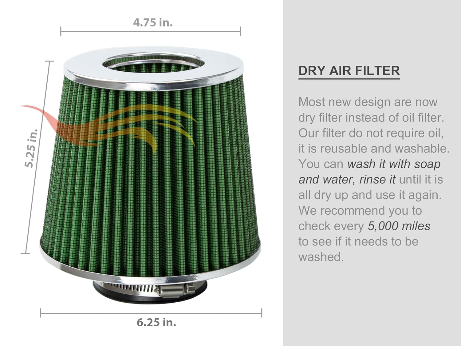 A instalação do filtro é simples e prática, pois vem com um clamp de aço inoxidável que assegura uma fixação segura. Todos os componentes necessários para a montagem estão incluídos, eliminando a necessidade de peças adicionais. Com uma altura de 8″, este filtro é projetado para se encaixar perfeitamente em uma variedade de sistemas de admissão de ar, tornando-o uma escolha versátil para entusiastas de automóveis e profissionais.