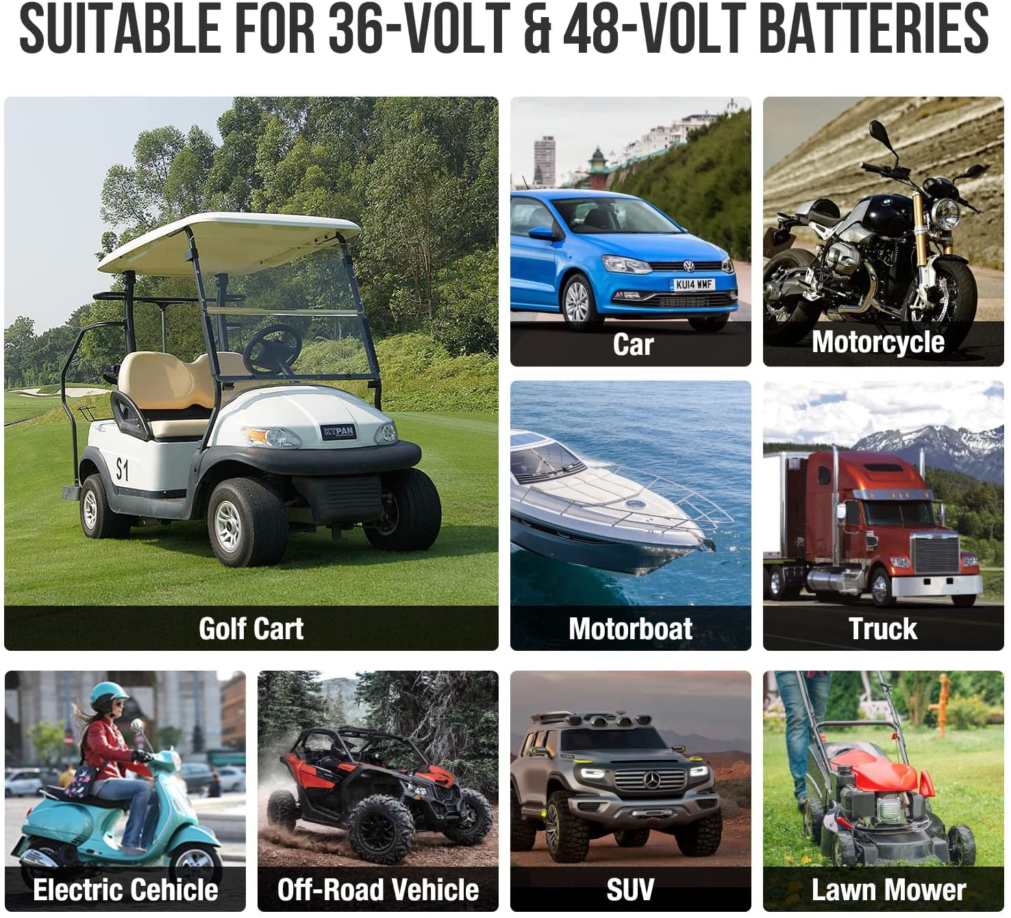 O Haisito Golf Cart Battery Charger é a solução definitiva para quem busca eficiência e segurança no carregamento de baterias de carrinhos de golfe. Com um impressionante circuito de carregamento de 18 Amp, este carregador é capaz de encher rapidamente a bateria do seu carrinho, oferecendo a opção de selecionar manualmente entre 36V e 48V. Com uma potência ultra-alta de 36V 18Amp e 48V 13Amp, ele é ideal para baterias de ciclo profundo, garantindo que não haja danos às células da bateria, seja ela de lítio, LifePO4 ou chumbo-ácido (AGM/GEL/EFB, MF, Flooded, VRLA, SLA, bateria úmida).