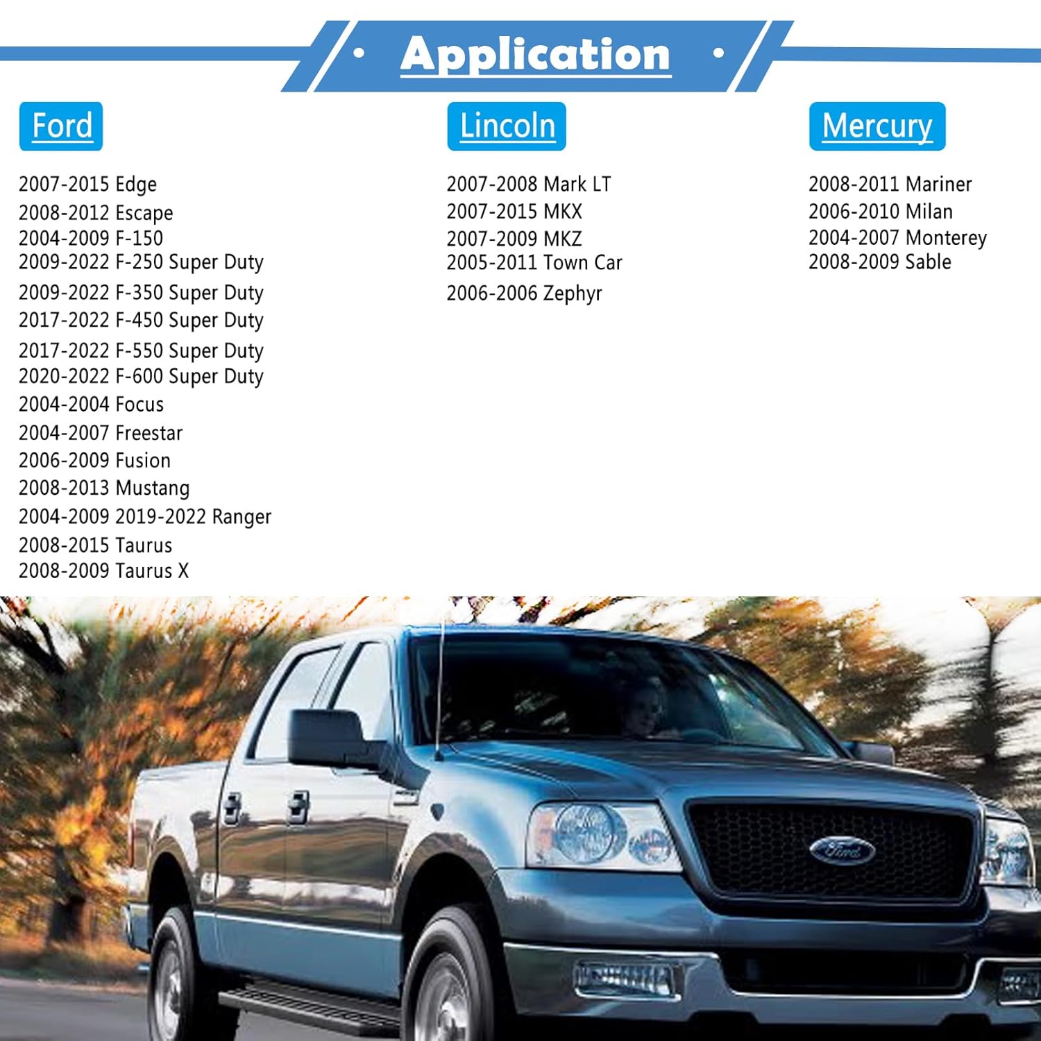 – Ford: Edge (2007-2015), Escape (2008-2012), F-150 (2004-2009), F-250 Super Duty (2009-2022), F-350 Super Duty (2009-2022), F-450 Super Duty (2017-2022), F-550 Super Duty (2017-2022), F-600 Super Duty (2020-2022), Focus (2004), Freestar (2004-2007), Fusion (2006-2009), Mustang (2008-2013), Ranger (2004-2015, 2019-2022), Taurus (2008-2015), Taurus X (2008-2009).