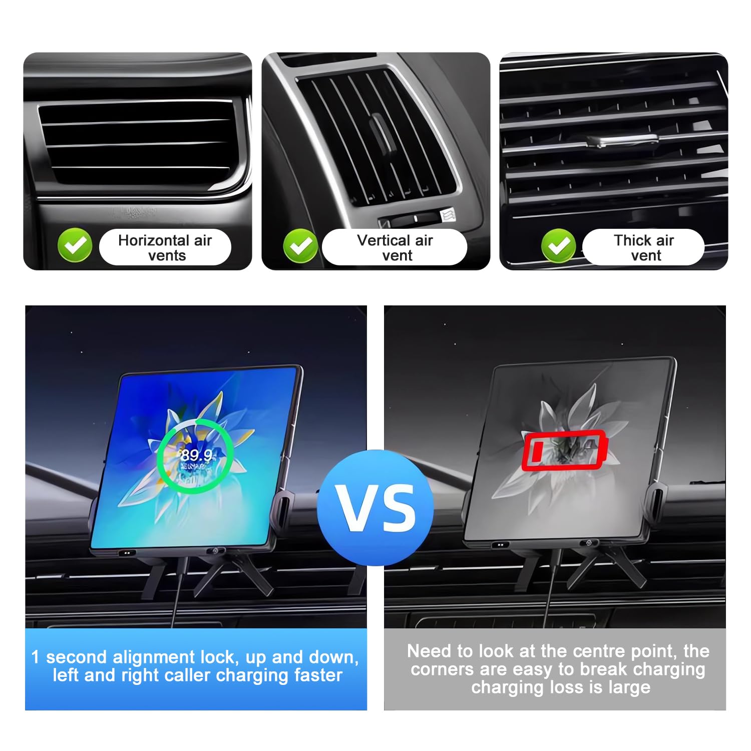 Com um carregador sem fio de 15W que possui um sistema de bobinas duplas, a eficiência de carregamento é maximizada. Este design inovador permite que o suporte se adapte a uma ampla gama de tamanhos e modelos de celulares, garantindo que 99% das aberturas de ventilação de carros sejam compatíveis.